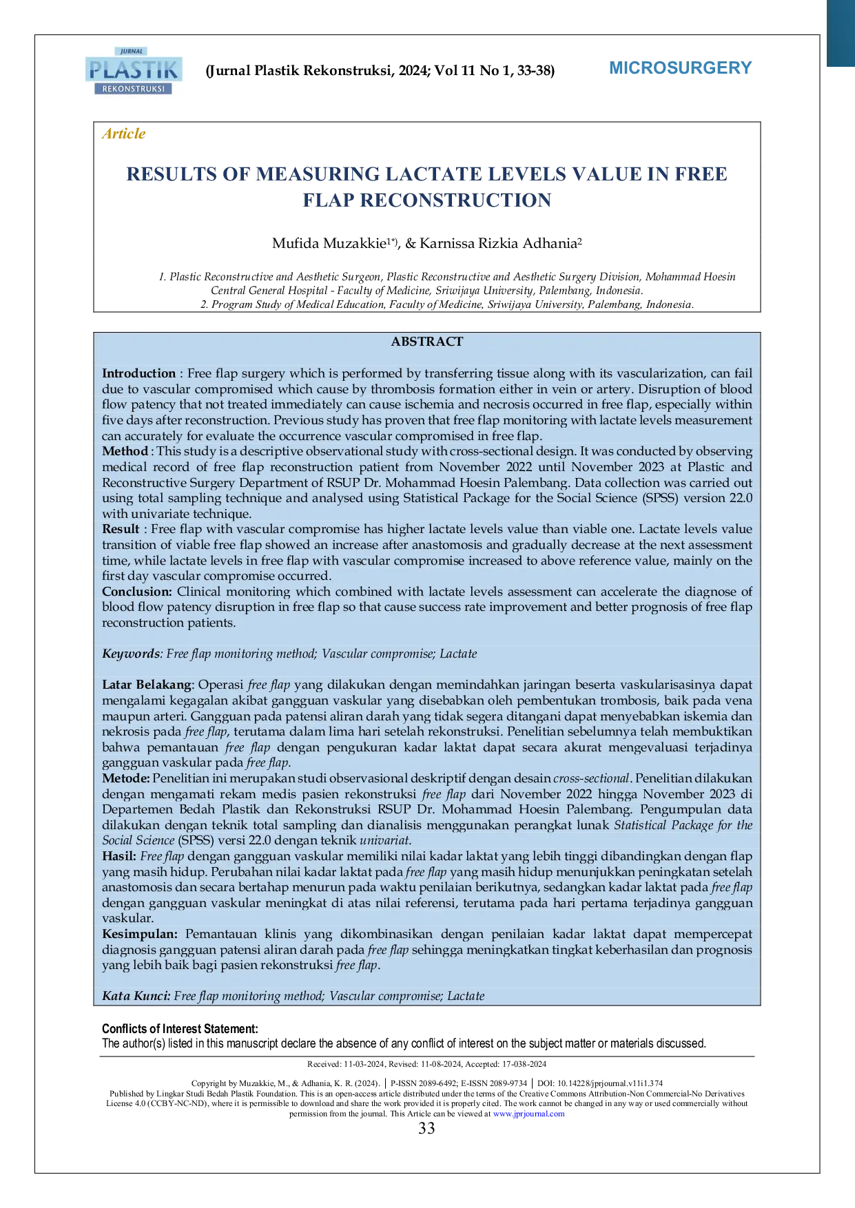Pemantauan klinis yang dikombinasikan dengan penilaian kadar laktat dapat mempercepat diagnosis gangguan patensi aliran darah pada flap bebas sehingga meningkatkan tingkat keberhasilan dan prognosis yang lebih baik bagi pasien rekonstruksi flap bebas.Pengukuran kadar laktat dalam flap bebas dapat menjadi metode objektif, mudah dilakukan, dan berbiaya rendah untuk mendeteksi gangguan aliran darah.Penelitian lebih lanjut diperlukan untuk menentukan nilai ambang batas kadar laktat yang optimal untuk diagnosis dini dan penanganan gangguan vaskular pada flap bebas.