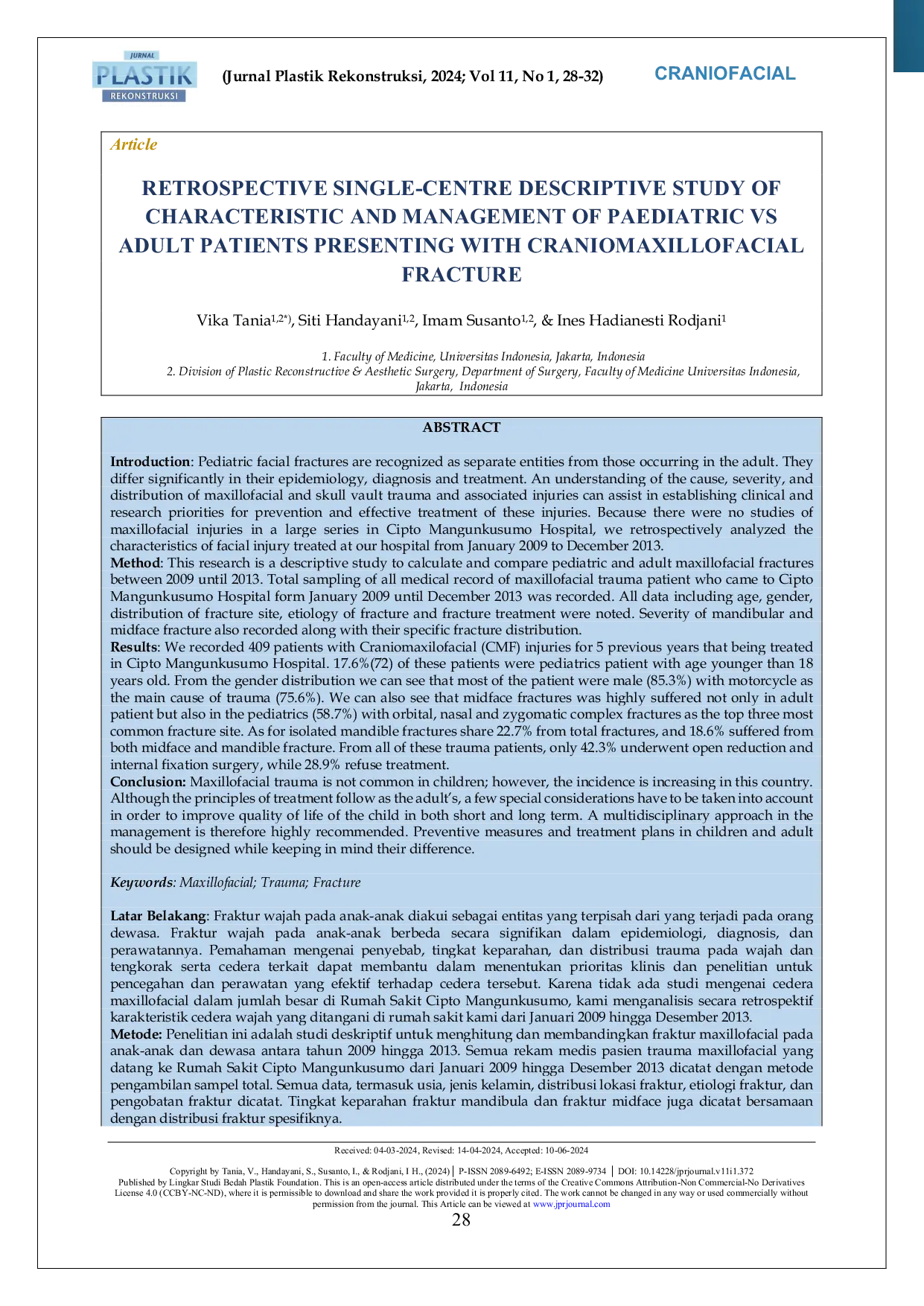 Jurnal Plastik RekonstruksiJurnal Plastik RekonstruksiFraktur wajah pada anak-anak diakui sebagai entitas yang terpisah dari yang terjadi pada orang dewasa. Fraktur ini berbeda secara signifikan dalam hal epidemiologi, diagnosis, dan penatalaksanaannya. Pemahaman mengenai penyebab, tingkat keparahan, dan distribusi trauma maksilofasial serta tengkorak dan cedera terkait dapat membantu dalam menentukan prioritas klinis dan penelitian untuk pencegahan serta perawatan yang efektif. Karena belum ada studi mengenai cedera maksilofasial dalam jumlah besar di Rumah Sakit Cipto Mangunkusumo, kami melakukan analisis retrospektif terhadap karakteristik cedera wajah yang ditangani di rumah sakit kami dari Januari 2009 hingga Desember 2013. Penelitian ini merupakan studi deskriptif untuk menghitung dan membandingkan fraktur maksilofasial pada pasien anak dan dewasa antara tahun 2009 hingga 2013. Seluruh rekam medis pasien trauma maksilofasial yang datang ke Rumah Sakit Cipto Mangunkusumo selama periode tersebut dicatat menggunakan metode total sampling. Data yang dikumpulkan meliputi usia, jenis kelamin, distribusi lokasi fraktur, etiologi fraktur, dan tata laksana fraktur. Keparahan fraktur mandibula dan midface juga dicatat bersama distribusi fraktur spesifiknya. Hasil menunjukkan terdapat 409 pasien dengan cedera kraniomaksilofasial (CMF) selama lima tahun terakhir, di mana 17,6% (72) merupakan pasien pediatrik berusia di bawah 18 tahun. Sebagian besar pasien adalah laki-laki (85,3%) dan sepeda motor merupakan penyebab utama trauma (75,6%). Fraktur midface banyak ditemukan baik pada pasien dewasa maupun anak (58,7%), dengan fraktur orbital, nasal, dan kompleks zygomatik sebagai tiga lokasi tersering. Fraktur mandibula terisolasi menyumbang 22,7% dari total fraktur, sedangkan 18,6% mengalami fraktur kombinasi midface dan mandibula. Hanya 42,3% pasien yang menjalani operasi reduksi terbuka dan fiksasi internal, sementara 28,9% menolak perawatan.