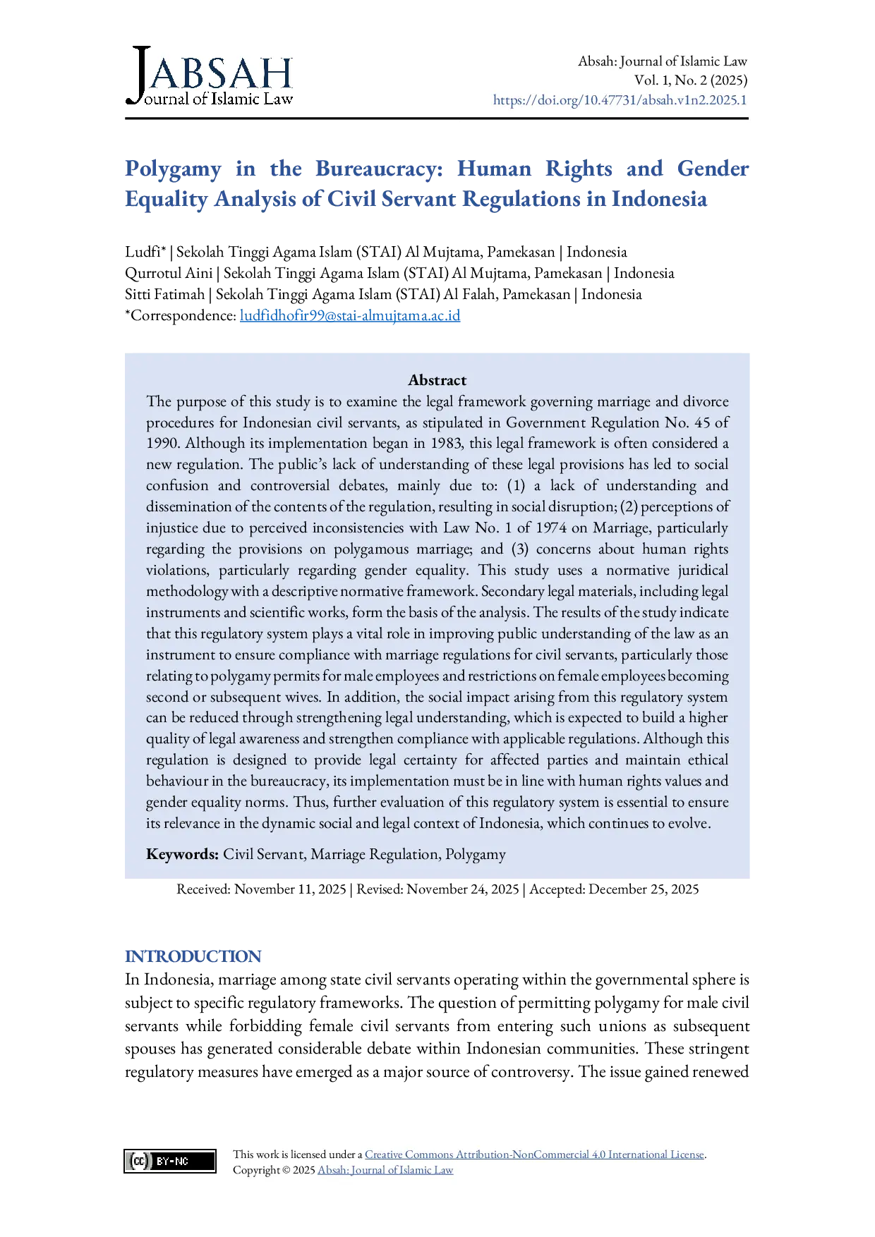 Absah: Journal of Islamic LawAbsah: Journal of Islamic LawTujuan penelitian ini adalah untuk menyelidiki kerangka hukum yang mengatur prosedur pernikahan dan perceraian bagi pegawai negeri Indonesia, sebagaimana yang diatur dalam Peraturan Pemerintah Nomor 45 Tahun 1990. Meskipun implementasinya dimulai pada tahun 1983, kerangka hukum ini sering dianggap sebagai peraturan baru. Kurangnya pemahaman masyarakat tentang ketentuan-ketentuan hukum ini telah menyebabkan kebingungan sosial dan perdebatan kontroversial, terutama karena: (1) kurangnya pemahaman dan penyebaran isi peraturan, yang menyebabkan gangguan sosial; (2) persepsi ketidakadilan karena dianggap tidak konsisten dengan Undang-Undang Nomor 1 Tahun 1974 tentang Perkawinan, khususnya mengenai ketentuan pernikahan poligami; dan (3) kekhawatiran tentang pelanggaran hak asasi manusia, khususnya mengenai kesetaraan gender. Penelitian ini menggunakan metodologi juridikal normatif dengan kerangka kerja deskriptif normatif. Bahan hukum sekunder, termasuk instrumen hukum dan karya ilmiah, menjadi dasar analisis. Hasil penelitian menunjukkan bahwa sistem regulasi ini memainkan peran vital dalam meningkatkan pemahaman publik tentang hukum sebagai alat untuk memastikan kepatuhan terhadap peraturan pernikahan bagi pegawai negeri, khususnya yang berkaitan dengan izin poligami bagi pegawai laki-laki dan pembatasan bagi pegawai perempuan menjadi istri kedua atau selanjutnya. Selain itu, dampak sosial yang timbul dari sistem regulasi ini dapat dikurangi melalui penguatan pemahaman hukum, yang diharapkan akan membangun kesadaran hukum yang lebih berkualitas dan memperkuat kepatuhan terhadap peraturan yang berlaku. Meskipun peraturan ini dirancang untuk memberikan kepastian hukum bagi pihak yang terkena dampaknya dan mempertahankan perilaku etis dalam birokrasi, implementasinya harus sejalan dengan nilai-nilai hak asasi manusia dan norma kesetaraan gender. Oleh karena itu, evaluasi lebih lanjut terhadap sistem regulasi ini sangat penting untuk memastikan relevansinya dalam konteks sosial dan hukum dinamis Indonesia yang terus berkembang.