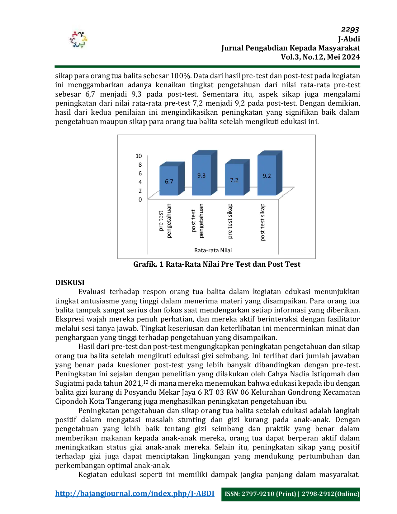 J-ABDI: Jurnal Pengabdian kepada MasyarakatJ-ABDI: Jurnal Pengabdian kepada MasyarakatKegiatan ini bertujuan untuk mengimplementasikan program pengabdian kepada masyarakat yang fokus pada edukasi stunting dan gizi seimbang serta pemberian makanan tambahan bagi anak balita melalui metode dari rumah ke rumah (door-to-door). Metode pelaksanaan melibatkan kegiatan edukasi leaflet, pemberian makanan tambahan menggunakan media langsung kepada balita, serta evaluasi pengetahuan dan sikap para orang tua balita melalui pre-test dan post-test. Hasil menunjukkan peningkatan signifikan pengetahuan (dari 6,7 menjadi 9,3) dan sikap (dari 7,2 menjadi 9,2) orang tua balita setelah mengikuti program. Program ini juga memberikan contoh konkret dalam pemberian makanan tambahan. Rekomendasi yang diambil adalah kelanjutan program serupa dalam skala lebih luas dengan dukungan pemerintah, lembaga kesehatan, dan kolaborasi ahli gizi.