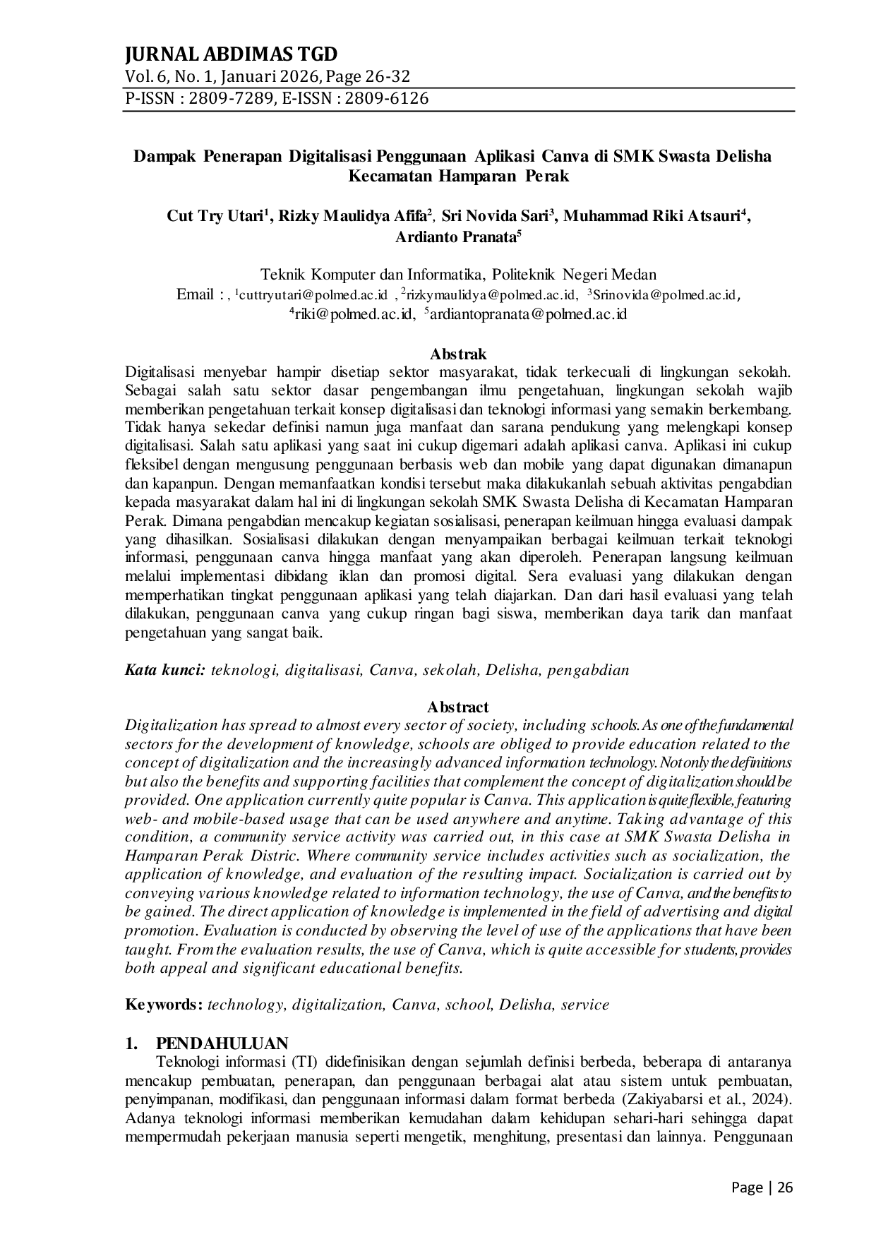 Jurnal Pengabdian Masyarakat IPTEKJurnal Pengabdian Masyarakat IPTEKDigitalisasi menyebar hampir disetiap sektor masyarakat, tidak terkecuali di lingkungan sekolah. Sebagai salah satu sektor dasar pengembangan ilmu pengetahuan, lingkungan sekolah wajib memberikan pengetahuan terkait konsep digitalisasi dan teknologi informasi yang semakin berkembang. Tidak hanya sekedar definisi namun juga manfaat dan sarana pendukung yang melengkapi konsep digitalisasi. Salah satu aplikasi yang saat ini cukup digemari adalah aplikasi canva. Aplikasi ini cukup fleksibel dengan mengusung penggunaan berbasis web dan mobile yang dapat digunakan dimanapun dan kapanpun. Dengan memanfaatkan kondisi tersebut maka dilakukanlah sebuah aktivitas pengabdian kepada masyarakat dalam hal ini di lingkungan sekolah SMK Swasta Delisha di Kecamatan Hamparan Perak. Dimana pengabdian mencakup kegiatan sosialisasi, penerapan keilmuan hingga evaluasi dampak yang dihasilkan. Sosialisasi dilakukan dengan menyampaikan berbagai keilmuan terkait teknologi informasi, penggunaan canva hingga manfaat yang akan diperoleh. Penerapan langsung keilmuan melalui implementasi dibidang iklan dan promosi digital. Sera evaluasi yang dilakukan dengan memperhatikan tingkat penggunaan aplikasi yang telah diajarkan. Dan dari hasil evaluasi yang telah dilakukan, penggunaan canva yang cukup ringan bagi siswa, memberikan daya tarik dan manfaat pengetahuan yang sangat baik.