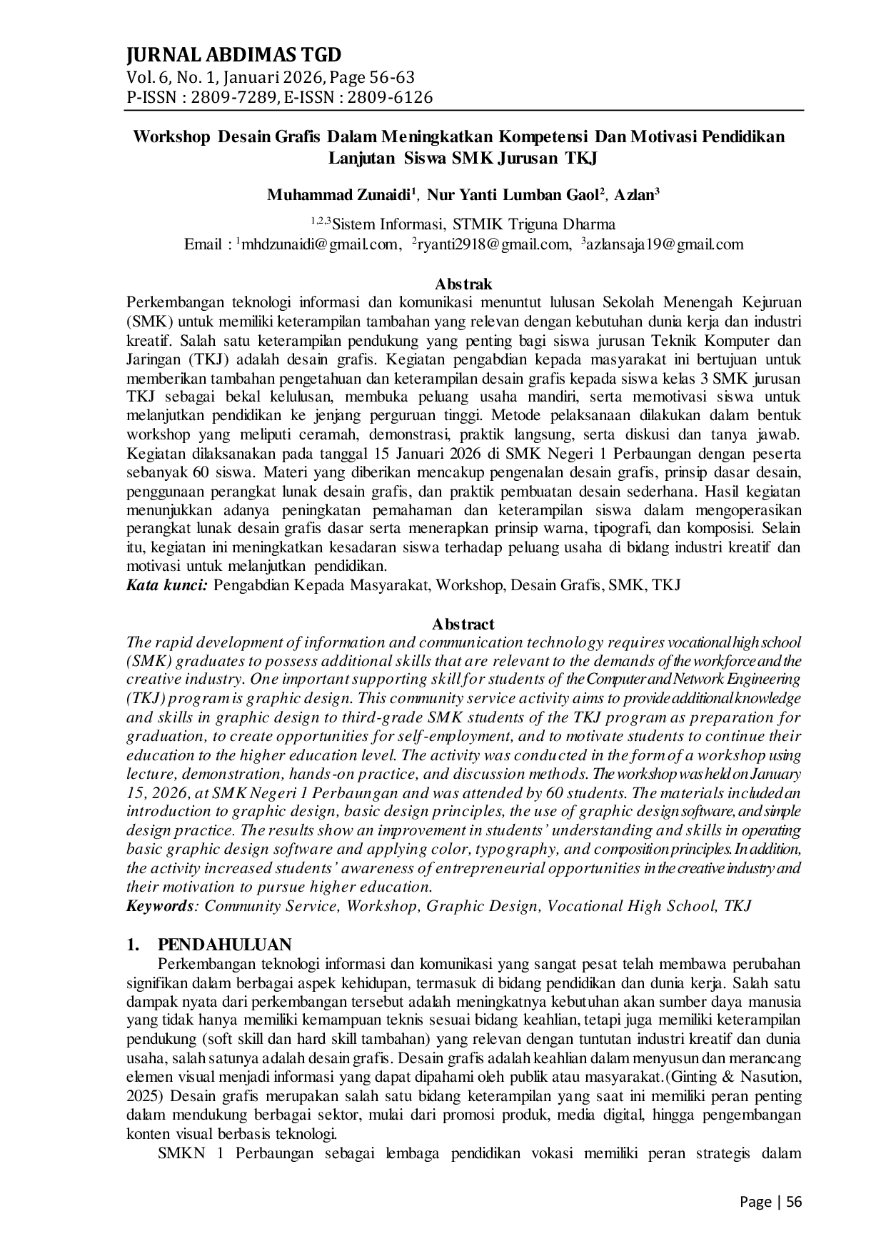 Jurnal Pengabdian Masyarakat IPTEKJurnal Pengabdian Masyarakat IPTEKPerkembangan teknologi informasi dan komunikasi menuntut lulusan Sekolah Menengah Kejuruan (SMK) untuk memiliki keterampilan tambahan yang relevan dengan kebutuhan dunia kerja dan industri kreatif. Salah satu keterampilan pendukung yang penting bagi siswa jurusan Teknik Komputer dan Jaringan (TKJ) adalah desain grafis. Kegiatan pengabdian kepada masyarakat ini bertujuan untuk memberikan tambahan pengetahuan dan keterampilan desain grafis kepada siswa kelas 3 SMK jurusan TKJ sebagai bekal kelulusan, membuka peluang usaha mandiri, serta memotivasi siswa untuk melanjutkan pendidikan ke jenjang perguruan tinggi. Metode pelaksanaan dilakukan dalam bentuk workshop yang meliputi ceramah, demonstrasi, praktik langsung, serta diskusi dan tanya jawab.