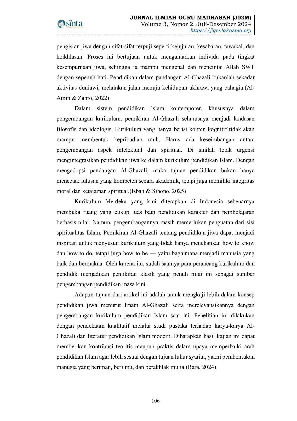 Jurnal Ilmiah Guru MadrasahJurnal Ilmiah Guru MadrasahImam Al-Ghazali merupakan salah satu tokoh besar dalam pemikiran Islam yang memberikan perhatian khusus pada aspek pendidikan spiritual. Menurut Al-Ghazali, konsep pendidikan spiritual tidak hanya berorientasi pada aspek intelektual, tetapi juga pada perkembangan moral dan spiritual siswa. Artikel ini bertujuan untuk mengkaji konsep pendidikan spiritual dalam pemikiran Al-Ghazali dan menghubungkannya dengan pengembangan kurikulum pendidikan Islam saat ini. Metode yang digunakan adalah tinjauan literatur dengan pendekatan kualitatif deskriptif. Temuan menunjukkan bahwa pendidikan spiritual dalam perspektif Al-Ghazali mencakup tazkiyatun nafs (pembersihan jiwa), takhalli (mengosongkan diri dari sifat-sifat buruk), dan tahalli (mengisi diri dengan sifat-sifat mulia). Relevansi pemikiran Al-Ghazali dapat menjadi landasan untuk pengembangan kurikulum yang menekankan pembentukan karakter, etika, dan spiritualitas di kalangan siswa.