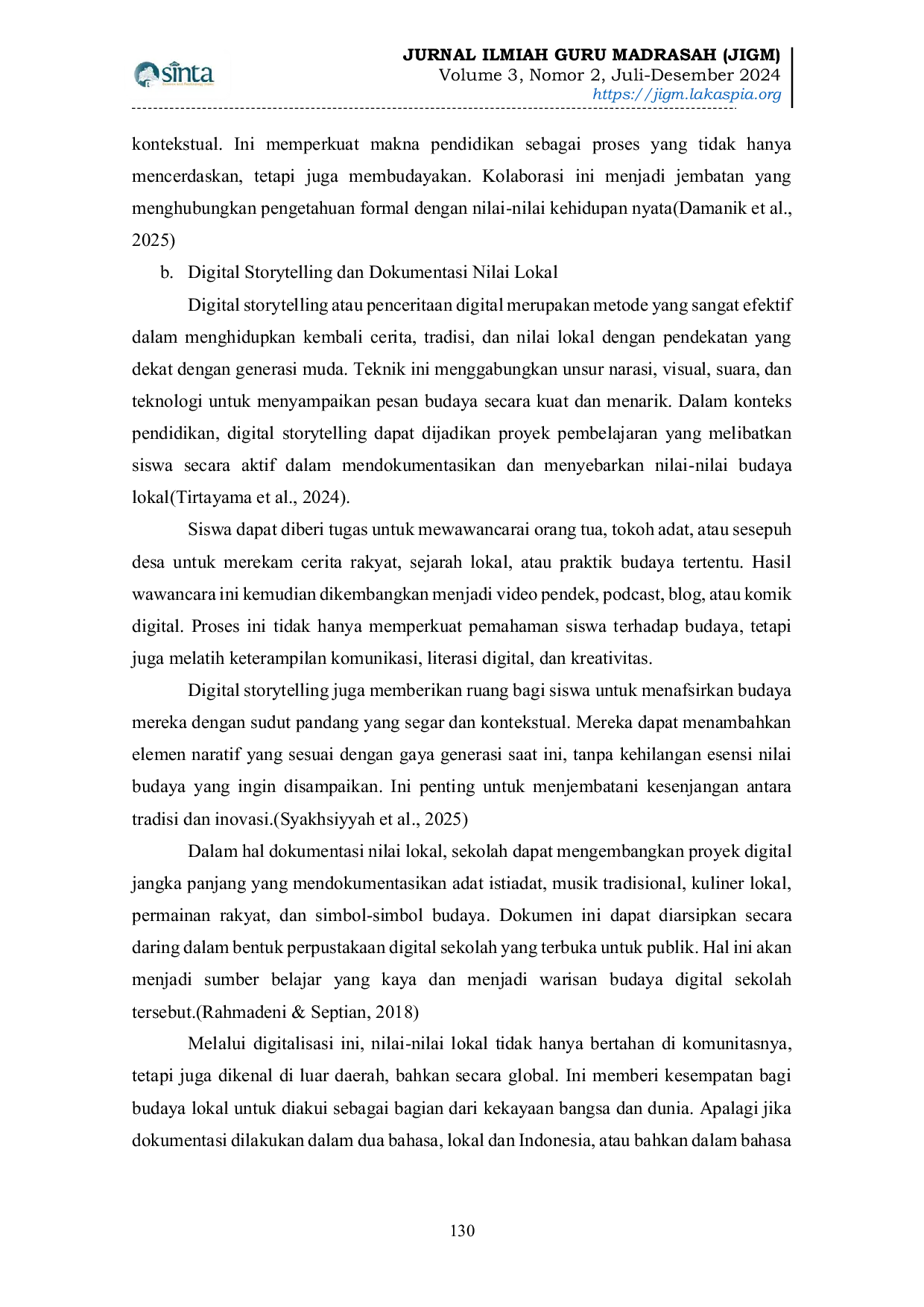 Jurnal Ilmiah Guru MadrasahJurnal Ilmiah Guru MadrasahEra digital membawa transformasi besar dalam dunia pendidikan, baik dari segi metode pembelajaran maupun konten yang disampaikan. Namun di balik kemajuan tersebut, terdapat tantangan serius dalam mempertahankan dan mentransmisikan nilai-nilai kearifan lokal kepada generasi muda. Penelitian ini bertujuan untuk mengeksplorasi bagaimana pendidikan dapat menjadi sarana strategis dalam merevitalisasi nilai-nilai lokal agar tetap relevan dan hidup di tengah arus globalisasi dan digitalisasi. Melalui pendekatan kualitatif dan studi pustaka, penulis menguraikan pentingnya integrasi nilai lokal dalam kurikulum, penggunaan media digital berbasis budaya lokal, serta peran pendidik sebagai agen pelestarian identitas budaya.