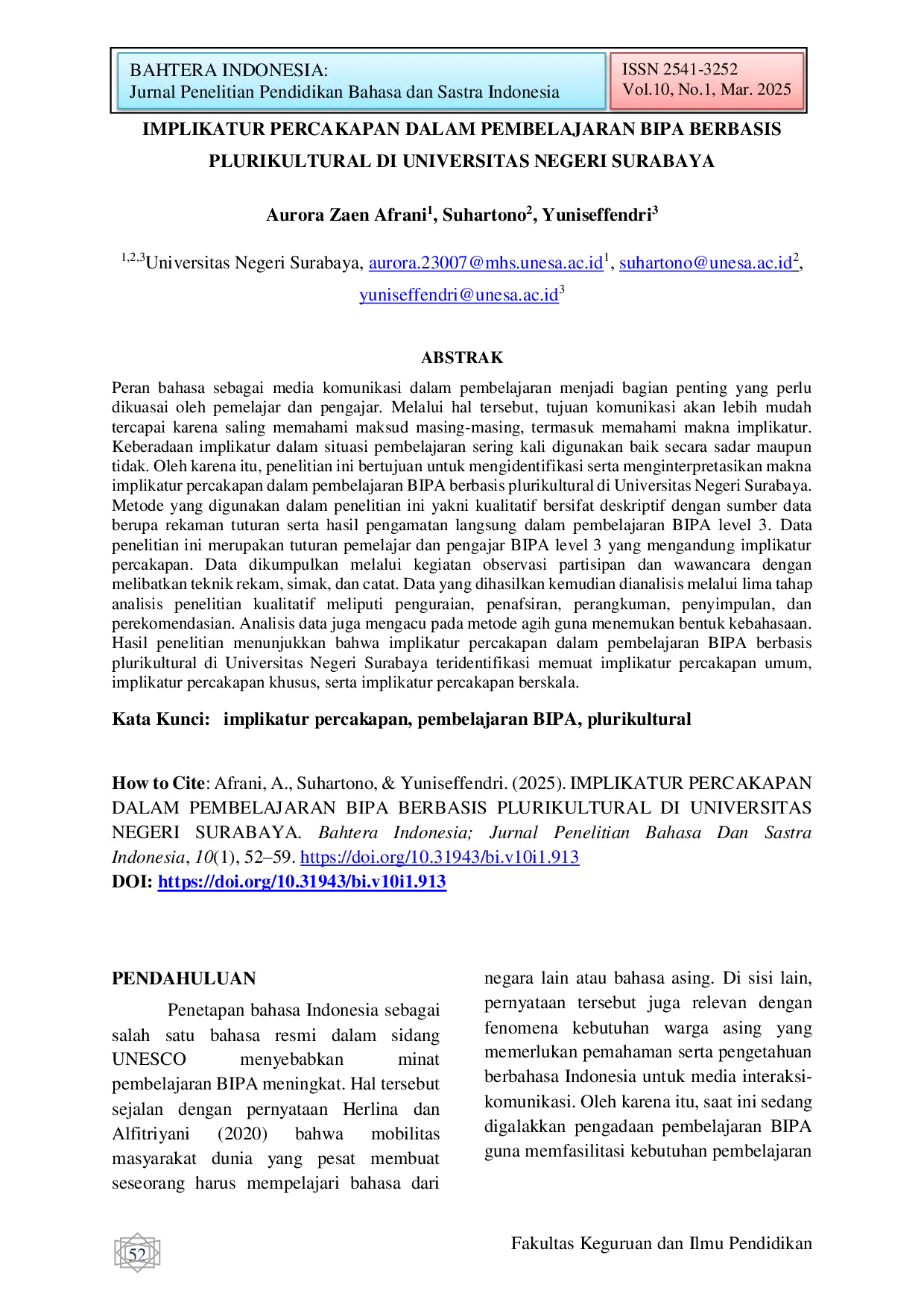 - IMPLIKATUR PERCAKAPAN DALAM PEMBELAJARAN BIPA BERBASIS PLURIKULTURAL DI UNIVERSITAS NEGERI SURABAYA |... doi.org/10.31943/bi.v10i1.913IMPLIKATUR PERCAKAPAN DALAM PEMBELAJARAN BIPA BERBASIS PLURIKULTURAL DI UNIVERSITAS NEGERI SURABAYA doi 10 31943 bi v10i1 913