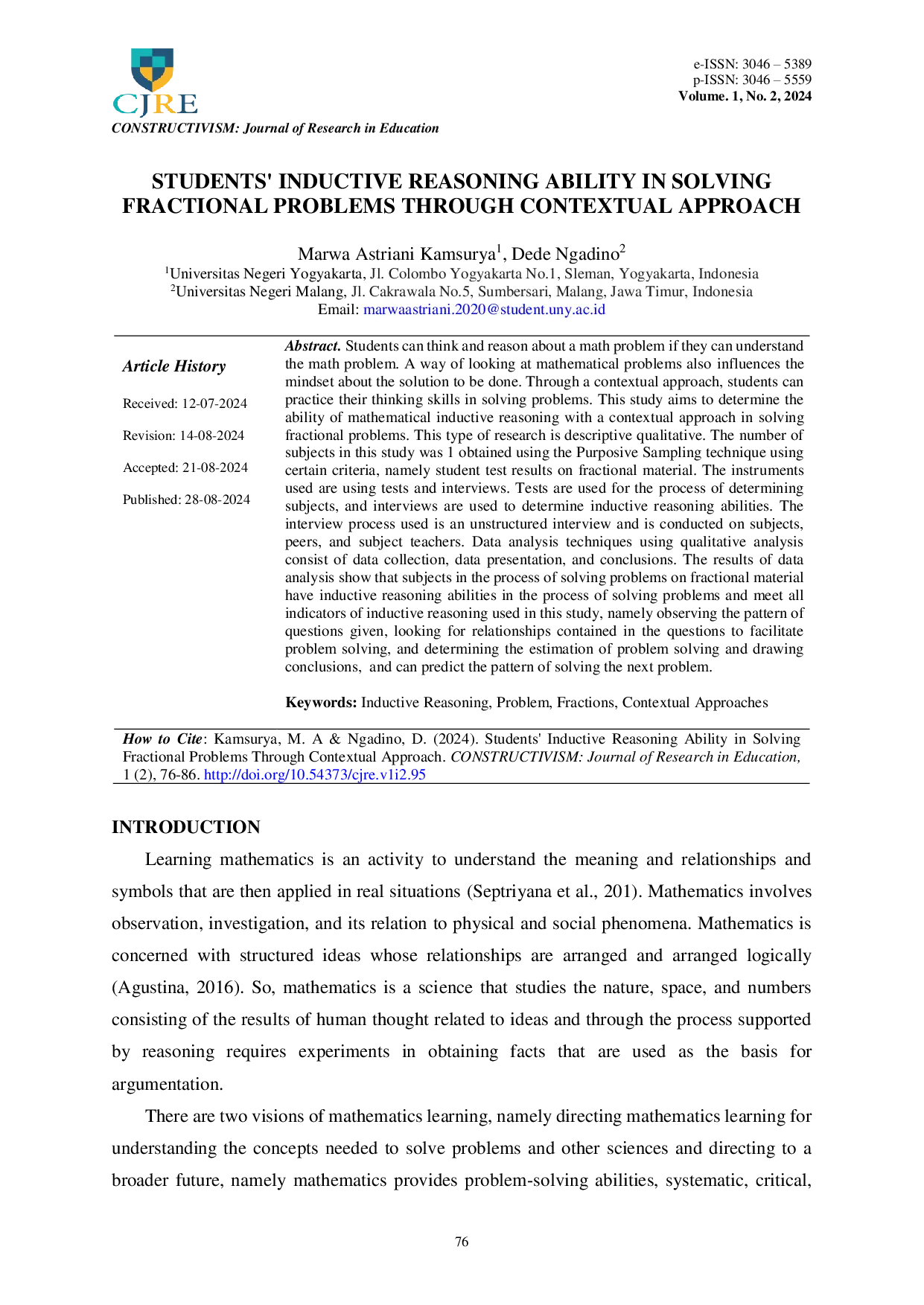 Constructivism: Journal of Research in EducationConstructivism: Journal of Research in EducationMahasiswa dapat berpikir dan bernalar tentang suatu masalah matematika jika mereka dapat memahami masalah tersebut. Cara pandang terhadap masalah matematika juga memengaruhi pola pikir tentang solusi yang akan dilakukan. Melalui pendekatan kontekstual, mahasiswa dapat melatih keterampilan berpikir mereka dalam memecahkan masalah. Penelitian ini bertujuan untuk menentukan kemampuan penalaran induktif matematika dengan pendekatan kontekstual dalam memecahkan masalah pecahan. Jenis penelitian ini adalah deskriptif kualitatif. Jumlah subjek dalam penelitian ini adalah 1 yang diperoleh menggunakan teknik Purposive Sampling menggunakan kriteria tertentu, yaitu hasil tes siswa pada materi pecahan. Instrumen yang digunakan adalah tes dan wawancara. Tes digunakan untuk proses penentuan subjek, dan wawancara digunakan untuk menentukan kemampuan penalaran induktif. Proses wawancara yang digunakan adalah wawancara tidak terstruktur dan dilakukan pada subjek, teman sebaya, dan guru subjek. Teknik analisis data menggunakan analisis kualitatif terdiri dari pengumpulan data, penyajian data, dan kesimpulan. Hasil analisis data menunjukkan bahwa subjek dalam proses pemecahan masalah pada materi pecahan memiliki kemampuan penalaran induktif dalam proses pemecahan masalah dan memenuhi semua indikator penalaran induktif yang digunakan dalam penelitian ini, yaitu mengamati pola pertanyaan yang diberikan, mencari hubungan yang terkandung dalam pertanyaan untuk memfasilitasi pemecahan masalah, dan menentukan perkiraan pemecahan masalah dan menarik kesimpulan, dan dapat memprediksi pola pemecahan masalah berikutnya.