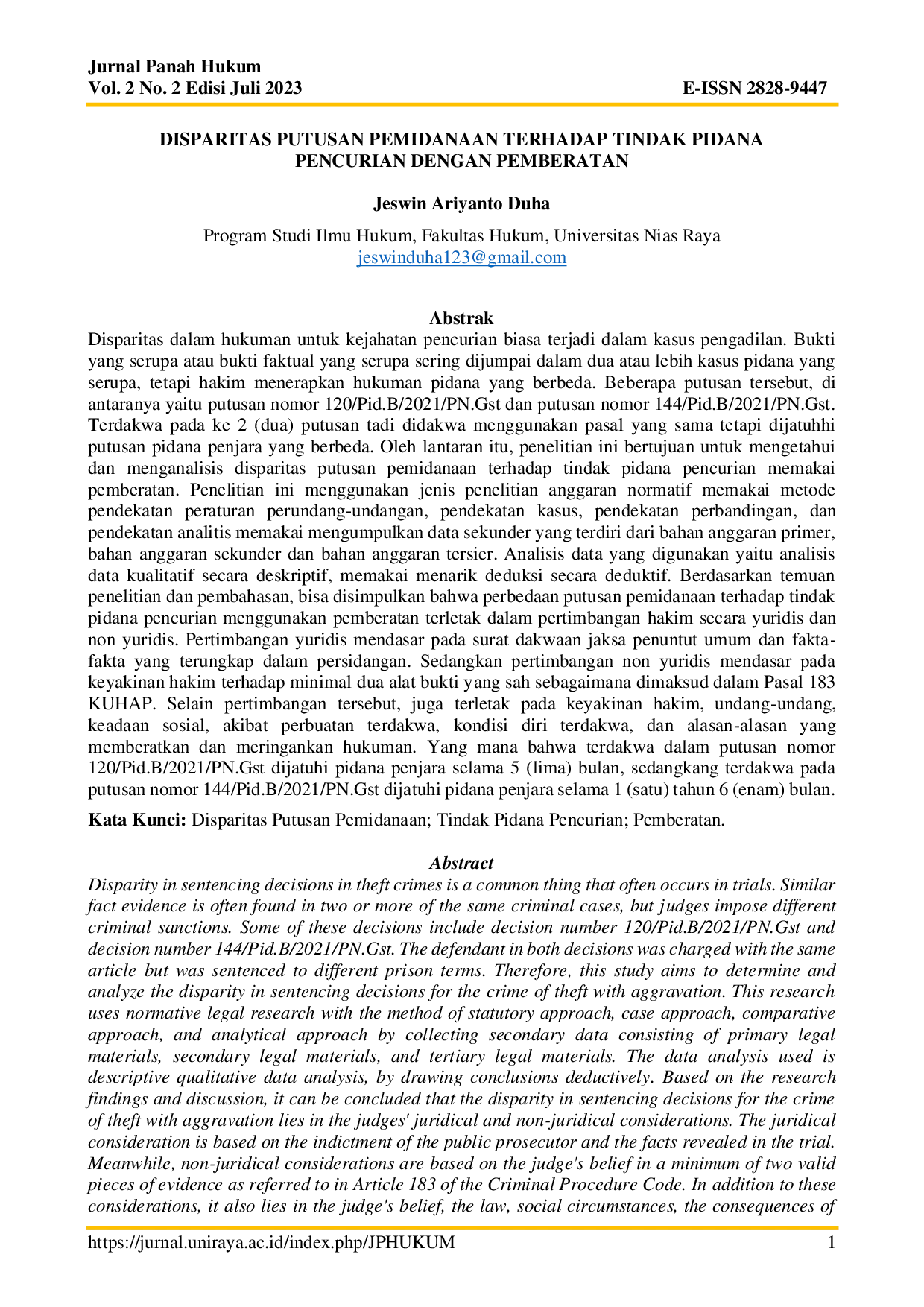 Jurnal Panah HukumJurnal Panah HukumDisparitas dalam hukuman untuk kejahatan pencurian biasa terjadi dalam kasus pengadilan. Bukti yang serupa atau bukti faktual yang serupa sering dijumpai dalam dua atau lebih kasus pidana yang serupa, tetapi hakim menerapkan hukuman pidana yang berbeda. Beberapa putusan tersebut, di antaranya yaitu putusan nomor 120/Pid.B/2021/PN.Gst dan putusan nomor 144/Pid.B/2021/PN.Gst. Terdakwa pada ke 2 (dua) putusan tadi didakwa menggunakan pasal yang sama tetapi dijatuhhi putusan pidana penjara yang berbeda. Oleh lantaran itu, penelitian ini bertujuan untuk mengetahui dan menganalisis disparitas putusan pemidanaan terhadap tindak pidana pencurian memakai pemberatan. Penelitian ini menggunakan jenis penelitian anggaran normatif memakai metode pendekatan peraturan perundang-undangan, pendekatan kasus, pendekatan perbandingan, dan pendekatan analitis memakai mengumpulkan data sekunder yang terdiri dari bahan anggaran primer, bahan anggaran sekunder dan bahan anggaran tersier. Analisis data yang digunakan yaitu analisis data kualitatif secara deskriptif, memakai menarik deduksi secara deduktif.