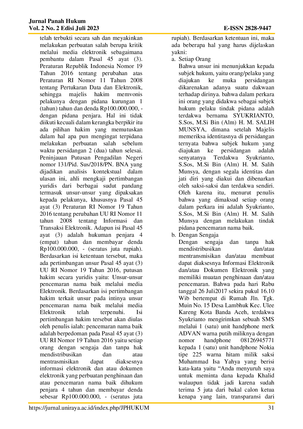Jurnal Panah HukumJurnal Panah HukumDemonstrasi kritik terhadap pelanggaran hukum melalui media elektronik dianggap melanggar pengaturan dan pedoman yang berlaku. Para peneliti tertarik untuk menggali pemikiran hakim dalam kasus pidana percobaan yang berkaitan dengan demonstrasi kritik melalui media elektronik, seperti yang terjadi dalam penyelidikan nomor 131/Pid.Sus/2018/PN.Bna. Metodologi penelitian yang digunakan adalah eksplorasi hukum yang sah, mengikuti peraturan dan pedoman, menganalisis pendekatan kasus, serta menerapkan logika yang tepat. Pengumpulan data dilakukan melalui bahan pustaka yang terdiri atas bahan primer, sekunder, dan tersier yang sah. Penelitian subjektif dilakukan untuk mencerahkan tujuan penelitian dengan pendekatan rasional. Hasil eksplorasi dan analisis membuktikan bahwa terdakwa Syukrianto, S.Sos, M.Si dan Almarhum H. M. Salih Munsya terbukti secara sah dan meyakinkan melakukan tindak pidana pencemaran nama baik melalui media elektronik. Hakim mempertimbangkan aspek yuridis dan non-yuridis dalam memberikan vonis yang tegas. Pertimbangan yuridis dan non-yuridis menjadi dasar pengambilan keputusan dalam kasus ini. Terdakwa dinyatakan bersalah dan dijatuhi hukuman penjara selama 1 tahun serta denda sebesar Rp100.000.000,-. Masa percobaan selama 2 tahun tidak diterapkan, meskipun mengabaikan Pasal 45 ayat (3) Peraturan Nomor 19 Tahun 2016 tentang Pertukaran Data dan Elektronik. Pertimbangan ini didasarkan pada fakta bahwa perbuatan terdakwa telah merugikan pihak lain dan adanya bukti kuat, termasuk keterangan saksi dan pengakuan terdakwa sendiri. Penelitian ini menyimpulkan bahwa tindakan pelanggaran hukum melalui pencemaran nama baik melalui media elektronik harus mendapat hukuman yang sesuai dengan pertimbangan yuridis dan non-yuridis. Meskipun ada anggapan bahwa keputusan ini merugikan terdakwa, namun berdasarkan analisis yang mendalam, hakim dianggap telah mengambil keputusan yang paling tepat.