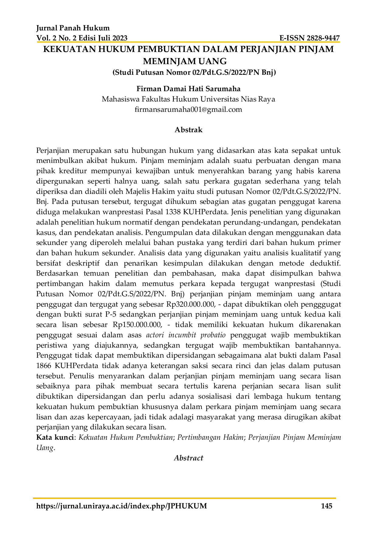 Jurnal Panah HukumJurnal Panah HukumPerjanjian merupakan satu hubungan hukum yang didasarkan atas kata sepakat untuk menimbulkan akibat hukum. Pinjam meminjam adalah suatu perbuatan dengan mana pihak kreditur mempunyai kewajiban untuk menyerahkan barang yang habis karena dipergunakan seperti halnya uang, salah satu perkara gugatan sederhana yang telah diperiksa dan diadili oleh Majelis Hakim yaitu studi putusan Nomor 02/Pdt.G.S/2022/PN. Bnj. Pada putusan tersebut, tergugat dihukum sebagian atas gugatan penggugat karena diduga melakukan wanprestasi Pasal 1338 KUHPerdata. Jenis penelitian yang digunakan adalah penelitian hukum normatif dengan pendekatan perundang-undangan, pendekatan kasus, dan pendekatan analisis. Pengumpulan data dilakukan dengan menggunakan data sekunder yang diperoleh melalui bahan pustaka yang terdiri dari bahan hukum primer dan bahan hukum sekunder. Analisis data yang digunakan yaitu analisis kualitatif yang bersifat deskriptif dan penarikan kesimpulan dilakukan dengan metode deduktif.