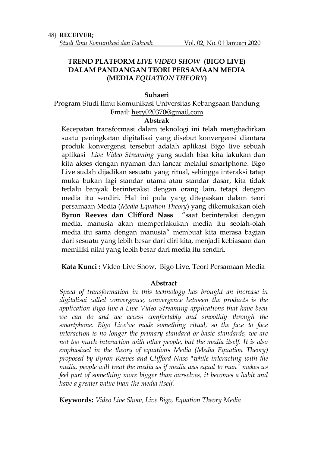 SERAMBI SYARIAH; Studi Ilmu-ilmu KeislamanSERAMBI SYARIAH; Studi Ilmu-ilmu KeislamanKecepatan transformasi dalam teknologi telah menghadirkan peningkatan digitalisasi yang disebut konvergensi. Salah satu produk konvergensi adalah aplikasi Bigo Live, sebuah aplikasi Live Video Streaming yang mudah diakses melalui smartphone. Bigo Live telah menjadi ritual, mengurangi interaksi tatap muka dan meningkatkan interaksi dengan media itu sendiri. Hal ini sejalan dengan Teori Persamaan Media yang menyatakan bahwa manusia memperlakukan media seolah-olah media itu adalah manusia, membuat kita merasa menjadi bagian dari sesuatu yang lebih besar dan memberikan nilai lebih pada media.