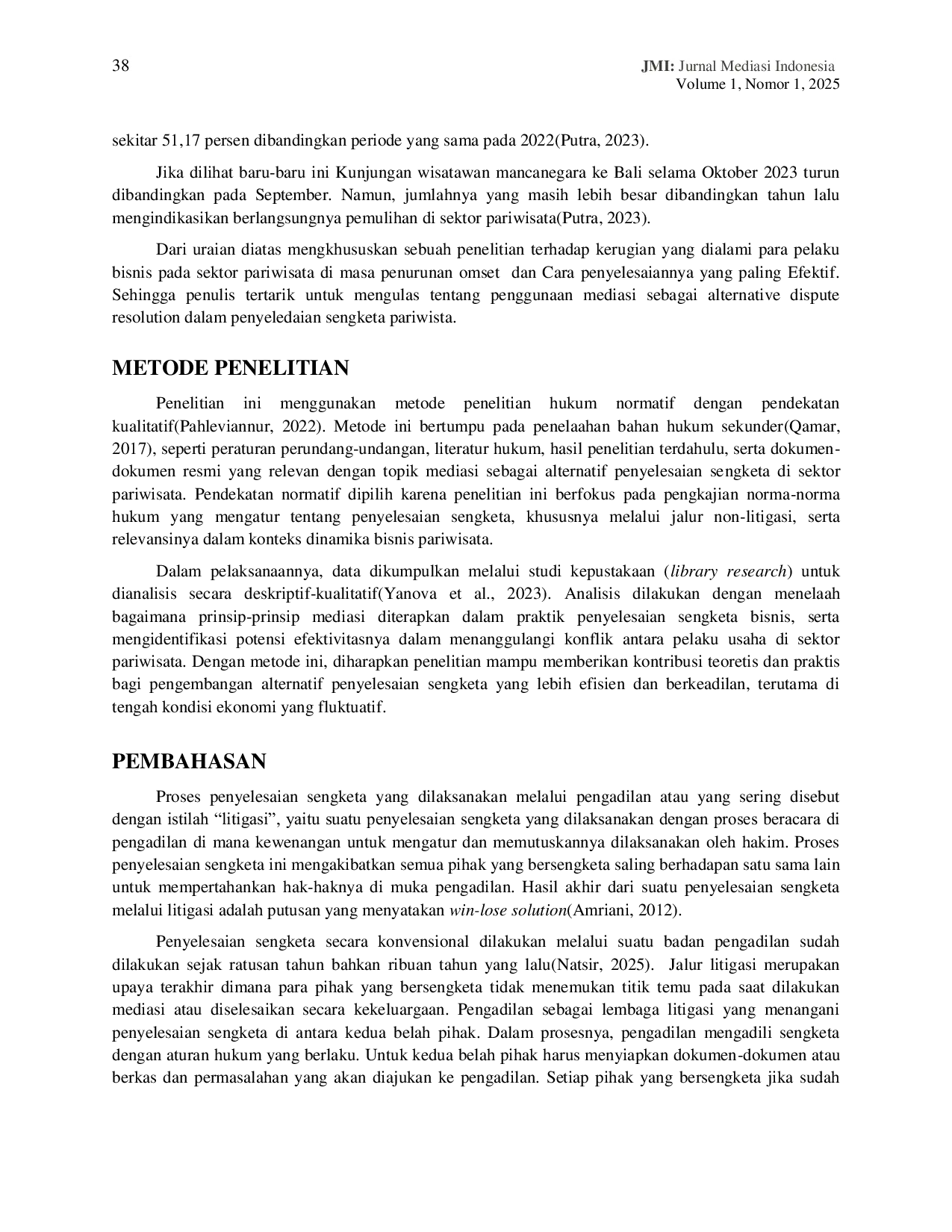 JURNAL MEDIASI INDONESIAJURNAL MEDIASI INDONESIAPariwisata merupakan salah satu industri gaya baru yang mampu menyediakan pertumbuhan ekonomi yang cepat dalam hal kesempatan kerja, pendapatan, taraf hidup dan dalam mengaktifkan sektor produksi lain di dalam negara penerima wisatawan. Bisnis merupakan suatu kegiatan untuk memperoleh keuntungan. Di dalam menjalankan bisnis, adakalanya ditemui perselisihan antara pelaku usaha dengan pelaku usaha lainnya. Terkadang sengketa yang terjadi adalah karena adanya salah satu pihak yang melakukan wanprestasi dan pihak lain merasa dirugikan. Penelitian ini menggunakan jenis penelitian kepustakaan, dengan pendekatan kualitatif normatif. Hasil penelitian ini menyimpulkan bahwa sengketa bisnis dapat terjadi kapan saja. Sebagai contoh sektor bisnis pariwisata yang kini omsetnya menurun drastis karena ada peraturan pemerintah yang mengharuskan dirumah saja dan tidak bepergian pada saat covid maupun pungutan pajak yang besar. Menurunnya omset sektor bisnis pariwisata menjadikan perusahaan lalai, seperti tidak membayar full gaji kepada pegawai dan telat dalam membayar pajak. Peristiwa seperti itu dapat menimbulkan sengketa antara perusahaan dengan individu. Upaya yang dilakukan dalam menyelesaikan sengketa ini salah satunya dilakukan upaya mediasi sebagai alternative dispute resolution.