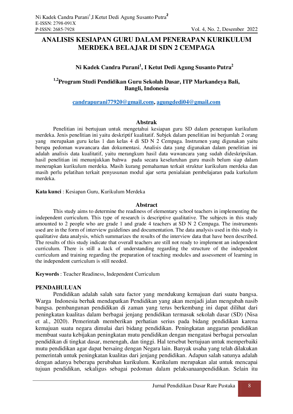 Jurnal Pendidikan Dasar Rare PustakaJurnal Pendidikan Dasar Rare PustakaPenelitian ini bertujuan untuk mengetahui kesiapan guru SD dalam penerapan kurikulum merdeka. Jenis penelitian ini adalah deskriptif kualitatif. Subjek penelitian terdiri dari 2 orang guru kelas 1 dan kelas 4 di SD N 2 Cempaga. Instrumen yang digunakan berupa pedoman wawancara dan dokumentasi. Analisis data yang digunakan adalah analisis data kualitatif, yaitu merangkum hasil data wawancara yang sudah dideskripsikan. Hasil penelitian menunjukkan bahwa secara keseluruhan guru masih belum siap dalam menerapkan kurikulum merdeka. Masih kurang pemahaman terkait struktur kurikulum merdeka dan masih perlu pelatihan terkait penyusunan modul ajar serta penilaian pembelajaran pada kurikulum merdeka.