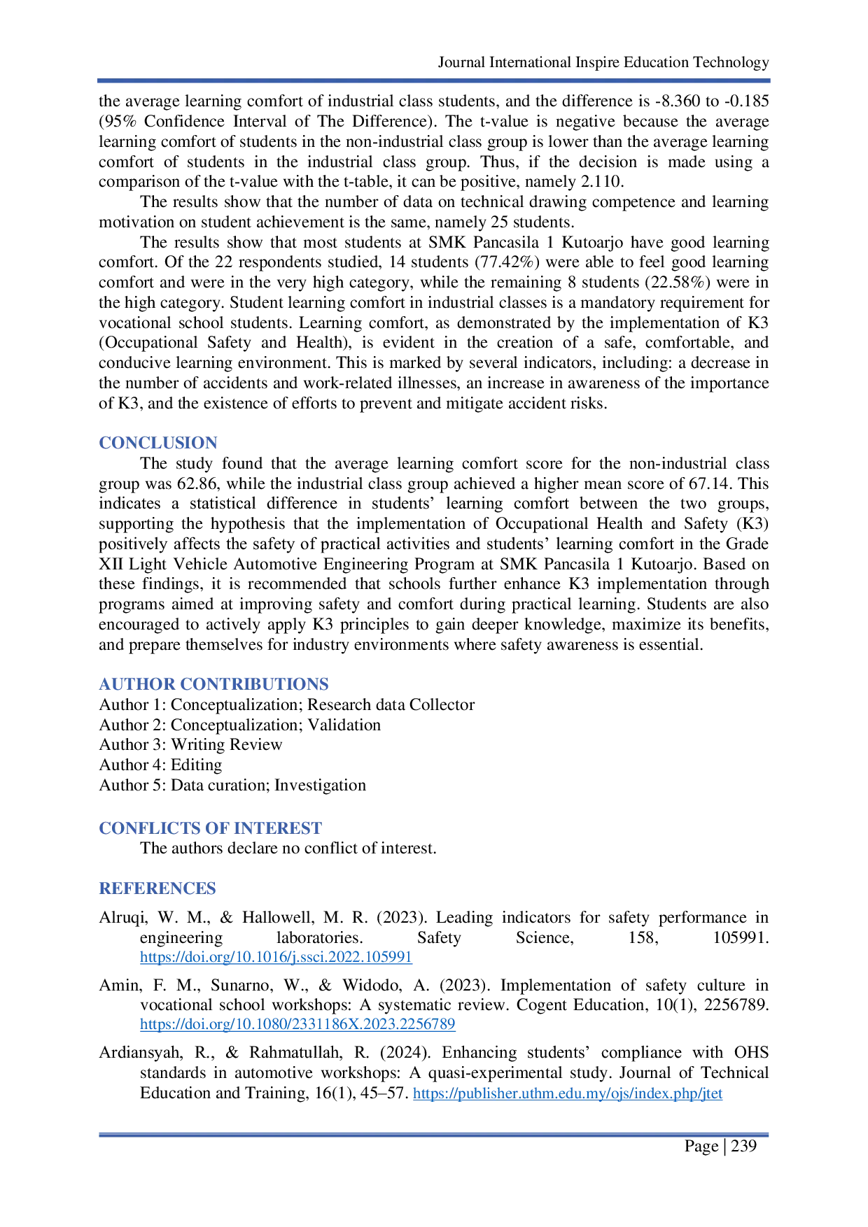 Journal International Inspire Education TechnologyJournal International Inspire Education TechnologyPenelitian ini menyelidiki bagaimana praktik Kesehatan dan Keselamatan Kerja (K3) membentuk keamanan dan kenyamanan belajar siswa kelas XII Teknik Kendaraan Ringan di SMK Pancasila 1 Kutoarjo. Menggunakan desain ex-post facto, data dikumpulkan dari 22 siswa melalui kuesioner terstruktur. Hasil deskriptif menunjukkan bahwa sebagian besar siswa merasa sangat nyaman selama kegiatan praktis, didukung oleh jumlah kecelakaan kecil yang lebih sedikit dan kesadaran yang lebih kuat tentang prosedur K3. Namun, analisis inferensial tidak mengonfirmasi hubungan linier yang signifikan antara implementasi K3 dan kenyamanan atau keamanan siswa (Fcount = 1,760 < Ftable = 1,846; α = 0,05). Oleh karena itu, penelitian ini menyimpulkan bahwa meskipun siswa menganggap lingkungan bengkel sebagai aman dan mendukung, persepsi ini tidak terbukti secara statistik dipengaruhi oleh implementasi K3.