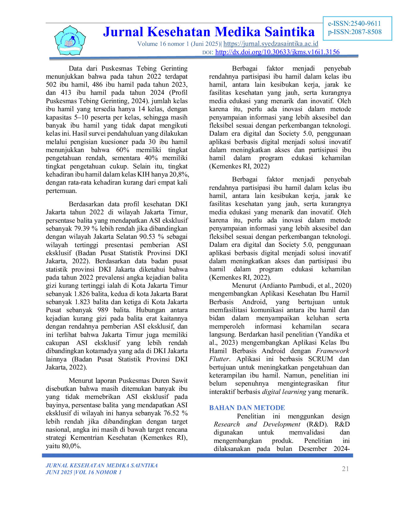 Jurnal Kesehatan Medika SaintikaJurnal Kesehatan Medika SaintikaKelas Ibu Hamil (KIH) merupakan salah satu intervensi yang dirancang untuk meningkatkan pengetahuan dan keterampilan ibu dalam menjaga kesehatan selama kehamilan, persalinan, dan perawatan nifas. Penelitian ini menggunakan metode Research and Development (R&D) dengan model design ADDIE. Populasi penelitian ini terdiri dari 5 bidan pengelola kelas ibu hamil dan 413 ibu hamil di Puskesmas Tebing Gerinting. Hasil penelitian menunjukkan bahwa aplikasi Kelas Bumil Sehat layak untuk digunakan dengan skor SUS 96,94. Aplikasi ini dinilai memiliki kualitas audio, bahasa yang jelas, kemudahan penggunaan, desain animasi menarik, tampilan video menarik, dan petunjuk penggunaan yang jelas.
