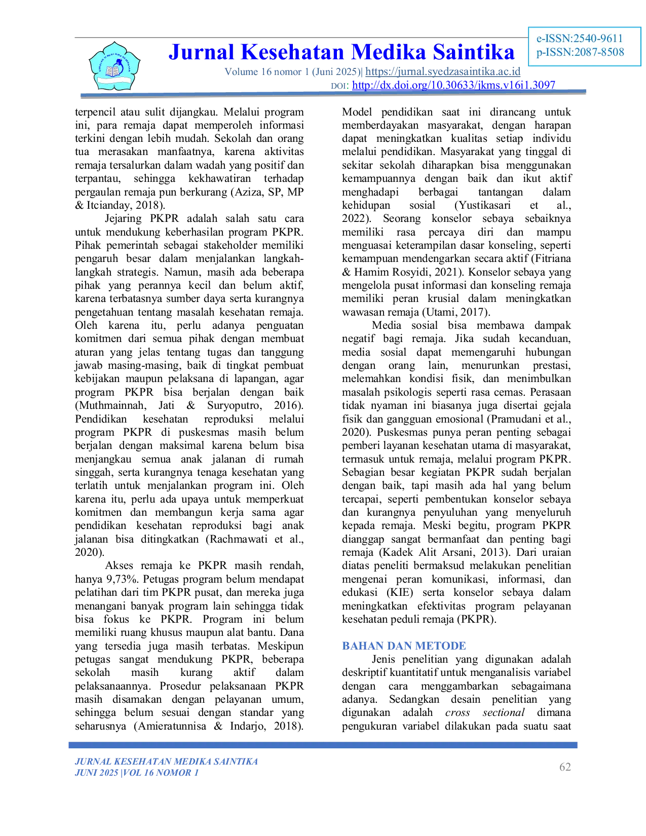 Jurnal Kesehatan Medika SaintikaJurnal Kesehatan Medika SaintikaProgram Pelayanan Kesehatan Peduli Remaja (PKPR) merupakan layanan kesehatan yang dirancang khusus untuk remaja, disesuaikan dengan minat, kebutuhan, dan karakter mereka. Penelitian ini bertujuan untuk mengetahui peran komunikasi, informasi, dan edukasi (KIE) serta konselor sebaya dalam meningkatkan efektivitas program pelayanan kesehatan peduli remaja (PKPR). Penelitian ini menggunakan pendekatan kuantitatif deskriptif dengan desain potong lintang (cross sectional), dan dilakukan di SMK Kesehatan Kabupaten Semarang dengan melibatkan 88 responden melalui teknik pengambilan sampel acak sederhana. Data dikumpulkan menggunakan kuesioner. Hasil penelitian menunjukkan bahwa program PKPR telah berjalan cukup baik dengan penyampaian informasi melalui media audio-visual dan metode interaktif yang sesuai kebutuhan remaja. Beberapa remaja juga telah membantu teman sebaya mencari bantuan profesional. Namun, keterlibatan mereka dalam advokasi dan evaluasi masih minim. Disarankan agar sekolah menyediakan ruang konseling dan melibatkan tenaga terlatih. Remaja perlu meningkatkan kesadaran diri, khususnya dalam penggunaan media sosial, dan memperluas pengetahuan tentang perilaku sehat. Pihak terkait juga perlu lebih aktif dalam supervisi dan evaluasi program secara rutin.