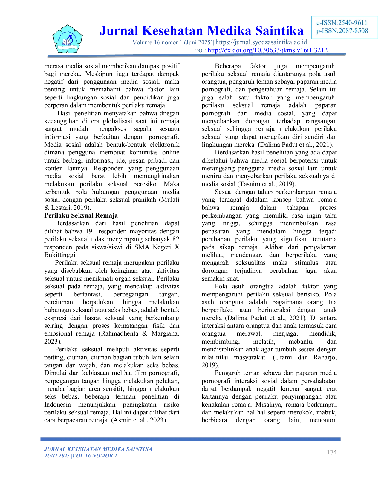 Jurnal Kesehatan Medika SaintikaJurnal Kesehatan Medika SaintikaRemaja merupakan kelompok populasi yang rentan terhadap berbagai perilaku berisiko yang dapat mengancam kesehatan mereka. Salah satu perilaku berisiko yang menjadi fokus dalam penelitian ini adalah perilaku seksual menyimpang pada remaja, salah satu penyebab perilaku seksual menyimpang ini diakibatkan oleh penggunaan media sosial. Tujuan penelitian ini adalah untuk mengetahui X Bukittinggi. Penelitian ini menggunakan desain Deskriptif Analitik dengan pendekatan Cross Sectional. Sampel dalam penelitian ini adalah siswa/siswi kelas XI di SMA Negeri dengan jumlah 191 orang dengan menggunakan teknik pengambilan sampel yaitu Cluster Sampling dan simple random. Hasil uji statistik didapatkan P value 0,032 (p > 0,05) yang menunjukkan adanya hubungan yang signifikan antara penggunaan media sosial dengan perilaku seksual remaja di SMA Negeri 5 Bukittinggi. Kesimpulan dari penelitian ini adalah sebagian besar remaja menggunakan media sosial dengan kategori positif, dan sebagian besar remaja memiliki perilaku seksual tidak menyimpang, sehingga terdapat X Bukittinggi. Penelitian ini diharapkan agar responden lebih meningkatkan kesadaran dan edukasi terhadap risiko perilaku seksual remaja, meningkatkan peran orangtua dan guru, serta lebih bijak dalam penggunaan media sosial.