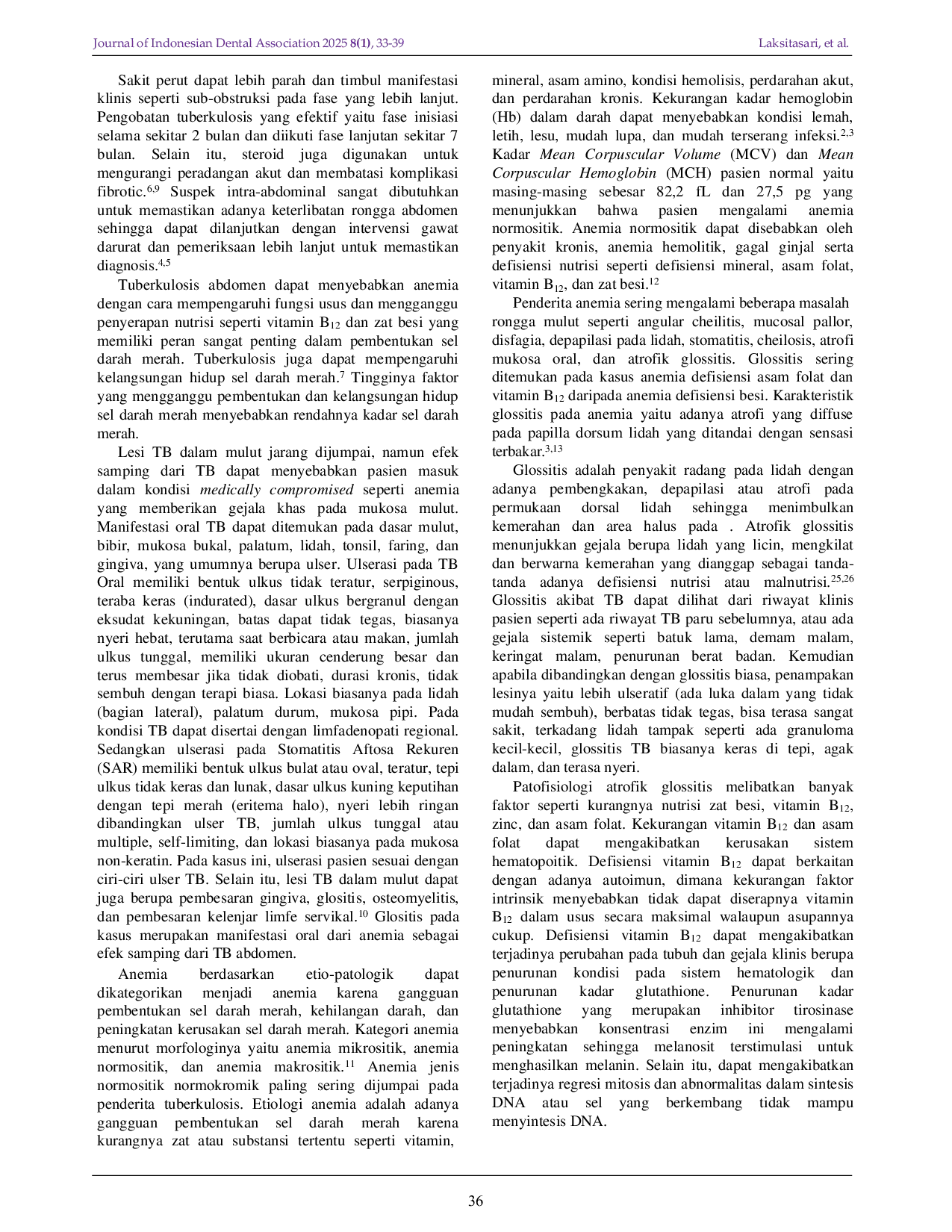 Journal of Indonesian Dental AssociationJournal of Indonesian Dental AssociationAnemia adalah kondisi penurunan jumlah eritrosit dan kadar hemoglobin, yang dapat disebabkan oleh tuberkulosis (TB) abdomen melalui beberapa mekanisme. Tuberkulosis abdomen disebabkan bakteri Mycobacterium tuberculosis, melibatkan saluran pencernaan, peritoneum, mesenterika, hati, dan limpa. Anemia penderita sering mengalami masalah rongga mulut. Tujuan: Menguraikan manifestasi klinis dan manifestasi oral pada pasien anemia dan TB abdomen. Studi Kasus: Pasien laki-laki berusia 34 tahun dirawat inap di RSUD Margono Soekarjo mengeluhkan perut membesar, kembung, sulit buang angin dan buang air besar sejak 1 bulan. Nafsu makan menurun. Pasien didiagnosis tuberkulosis abdomen dan anemia. Terdapat lesi ulser pada gingiva bukal rahang atas dan bawah, serta atrofi papilla lidah sehingga pasien didiagnosis stomatitis aftosa rekuren dan atrophic glossitis. Manajemen pada pasien berupa instruksi menjaga kebersihan rongga mulut dengan menyikat gigi, menggunakan obat kumur, mengonsumsi makanan bergizi, mengurangi stress, rajin berolahraga, serta minum obat sesuai resep dokter spesialis penyakit dalam. Diskusi: Anemia dapat disebabkan oleh tuberkulosis abdomen melalui perdarahan, gangguan penyerapan nutrisi, dan efek sistemik. Fungsi usus terganggu sehingga menghambat penyerapan nutrisi seperti vitamin B12 dan zat besi yang penting dalam pembentukan eritrosit. Penderita anemia sering mengalami masalah rongga mulut seperti stomatitis dan glossitis. Glossitis yaitu atrofi pada papilla dorsum lidah ditandai sensasi terbakar. Recurrent aphthous stomatitis dapat terjadi karena transportasi oksigen dan nutrisi terganggu sehingga menghambat pertumbuhan dan diferensiasi sel epitel. Kesimpulan: Anemia salah satunya dapat disebabkan oleh tuberkulosis abdomen dan menimbulkan manifestasi pada oral seperti glossitis dan stomatitis aftosa rekuren. Penegakan diagnosis yang baik dapat menentukan pengobatan yang tepat.