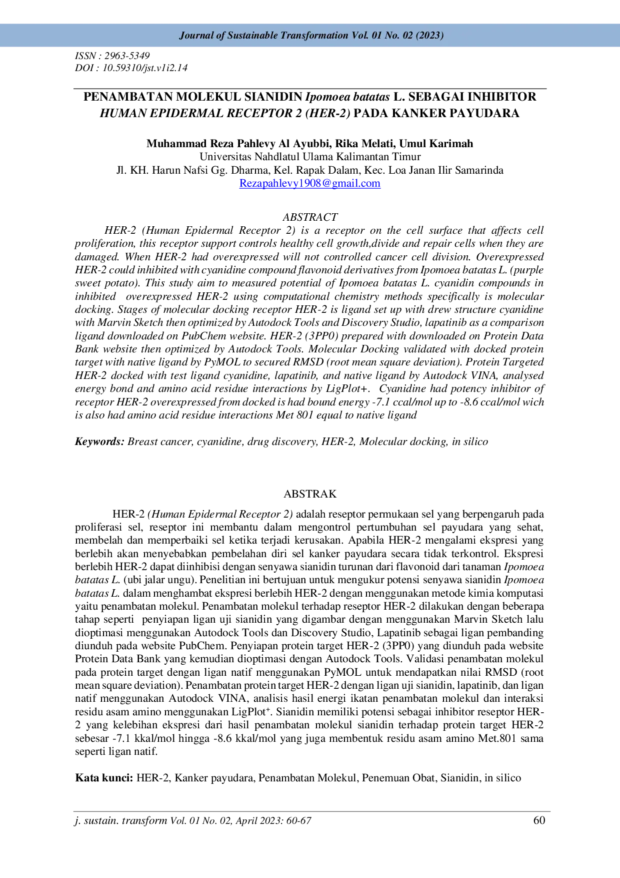 Journal of Sustainable TransformationJournal of Sustainable TransformationHER-2 (Human Epidermal Receptor 2) adalah reseptor permukaan sel yang berpengaruh pada proliferasi sel, reseptor ini membantu dalam mengontrol pertumbuhan sel payudara yang sehat, membelah dan memperbaiki sel ketika terjadi kerusakan. Apabila HER-2 mengalami ekspresi yang berlebih akan menyebabkan pembelahan diri sel kanker payudara secara tidak terkontrol. Ekspresi berlebih HER-2 dapat diinhibisi dengan senyawa sianidin turunan dari flavonoid dari tanaman Ipomoea batatas L. (ubi jalar ungu). Penelitian ini bertujuan untuk mengukur potensi senyawa sianidin Ipomoea batatas L. dalam menghambat ekspresi berlebih HER-2 dengan menggunakan metode kimia komputasi yaitu penambatan molekul. Penambatan molekul terhadap reseptor HER-2 dilakukan dengan beberapa tahap seperti penyiapan ligan uji sianidin yang digambar dengan menggunakan Marvin Sketch lalu dioptimasi menggunakan Autodock Tools dan Discovery Studio, Lapatinib sebagai ligan pembanding diunduh pada website PubChem. Penyiapan protein target HER-2 (3PP0) yang diunduh pada website Protein Data Bank yang kemudian dioptimasi dengan Autodock Tools. Validasi penambatan molekul pada protein target dengan ligan natif menggunakan PyMOL untuk mendapatkan nilai RMSD (root mean square deviation). Penambatan protein target HER-2 dengan ligan uji sianidin, lapatinib, dan ligan natif menggunakan Autodock VINA, analisis hasil energi ikatan penambatan molekul dan interaksi residu asam amino menggunakan LigPlot . Sianidin memiliki potensi sebagai inhibitor reseptor HER-2 yang kelebihan ekspresi dari hasil penambatan molekul sianidin terhadap protein target HER-2 sebesar -7.1 kkal/mol hingga -8.6 kkal/mol yang juga membentuk residu asam amino Met.801 sama seperti ligan natif.