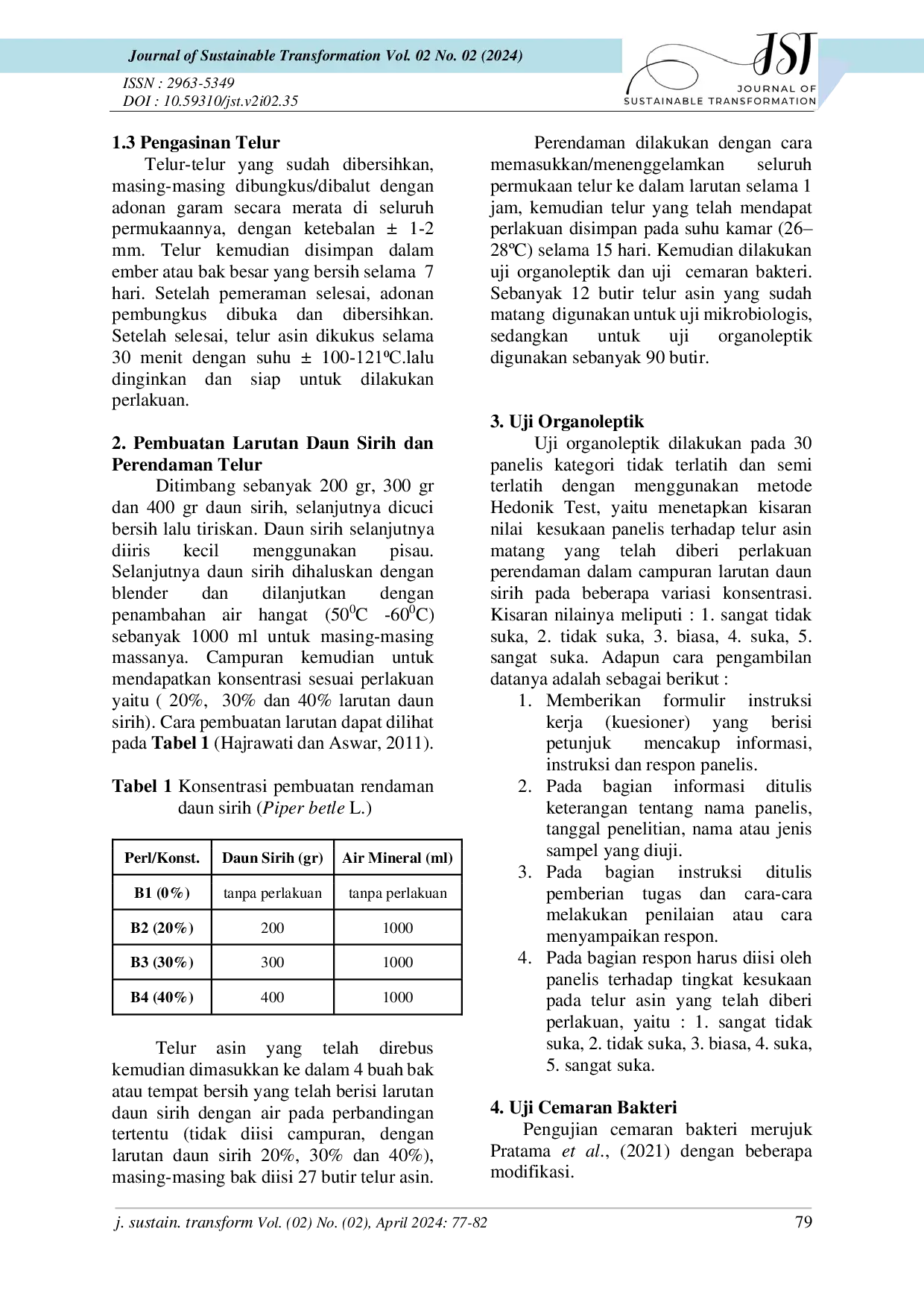 Journal of Sustainable TransformationJournal of Sustainable TransformationTelur mudah mengalami penurunan kualitas yang disebabkan oleh penguapan air dan CO2. Tujuan penelitian ini adalah untuk mengetahui pengaruh perendaman daun sirih (Piper betle L.) dalam peningkatan kualitas telur asin yang dianalisa dengan menghitung jumlah bakteri terhadap kualitas telur asin. Penelitian dilakukan dengan Rancangan Acak Lengkap (RAL), data dianalisis menggunakan uji ANOVA dan uji lanjut BNJ dengan taraf signifikansi 5%. Sampel dalam penelitian ini berjumlah 120 butir telur bebek yang dibagi menjadi 4 perlakuan yaitu tanpa perendaman larutan daun sirih (AB1) dan dengan perendaman larutan daun sirih 20% (AB2), 30% (AB3), dan 40% (AB4) dengan 3 kali ulangan untuk uji organleptik. Hasil terbaik untuk uji organoleptik yaitu pada perendaman konsentrasi 40% sementara itu, total bakteri pada telur asin perendaman konsentrasi 30% diperoleh hasil terbaik, dengan nilai 35x104 cfu/g. Telur asin dan larutan daun sirih konsentrasi 40% yang paling disukai panelis. Hasil telur asin yang diberi perlakuan perendaman larutan daun sirih pada konsentrasi 30% memberikan jumlah cemaran bakteri yang paling kecil jika dibandingkan dengan yang lainnya.