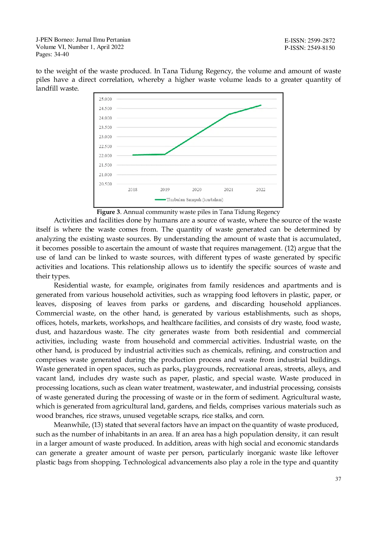 J-PEN Borneo : Jurnal Ilmu PertanianJ-PEN Borneo : Jurnal Ilmu PertanianKabupaten Tana Tidung merupakan daerah pertanian yang didominasi, dengan sekitar 61,51 persen dari luas total wilayah kabupaten dialokasikan untuk tujuan pertanian, yang berjumlah 297.028,7 hektar. Meskipun memiliki FDS (Tempat Penampungan Akhir) yang membentang kurang lebih empat hektar dan dikelola melalui sistem sanitary landfill, daerah ini masih menggunakan sistem pembuangan sampah terbuka. Limbah organik yang ditemukan di FDS dapat diubah menjadi kompos, yang dapat dimanfaatkan untuk memenuhi kebutuhan pupuk petani di Kabupaten Tana Tidung. Tujuan utama penelitian ini adalah untuk menentukan potensi produksi kompos di Kabupaten Tana Tidung. Penelitian dilakukan dari Mei 2022 hingga Januari 2023, hanya mengandalkan data sekunder. Data sekunder yang digunakan adalah data timbunan sampah dari lima tahun terakhir, yang diperoleh dari Bidang Sampah Dinas Lingkungan Hidup Kabupaten Tana Tidung. Data tentang sampah disajikan dalam bentuk grafik, sementara analisis proyeksi data kompos menggunakan ketentuan Zulfinar dan Sembiring (2015) dalam tiga skenario: pesimis, moderat, dan optimis. Berdasarkan temuan penelitian, volume sampah yang dihasilkan di Kabupaten Tana Tidung pada tahun 2022 akan berjumlah 24.675.825 liter, dengan total penampungan 24.676 ton. Dalam skenario pesimis, tidak akan terjadi pengolahan sampah menjadi kompos pada tahun 2022, sedangkan skenario moderat memperkirakan 17.273 ton, dan skenario optimis memperkirakan 19.741 ton.