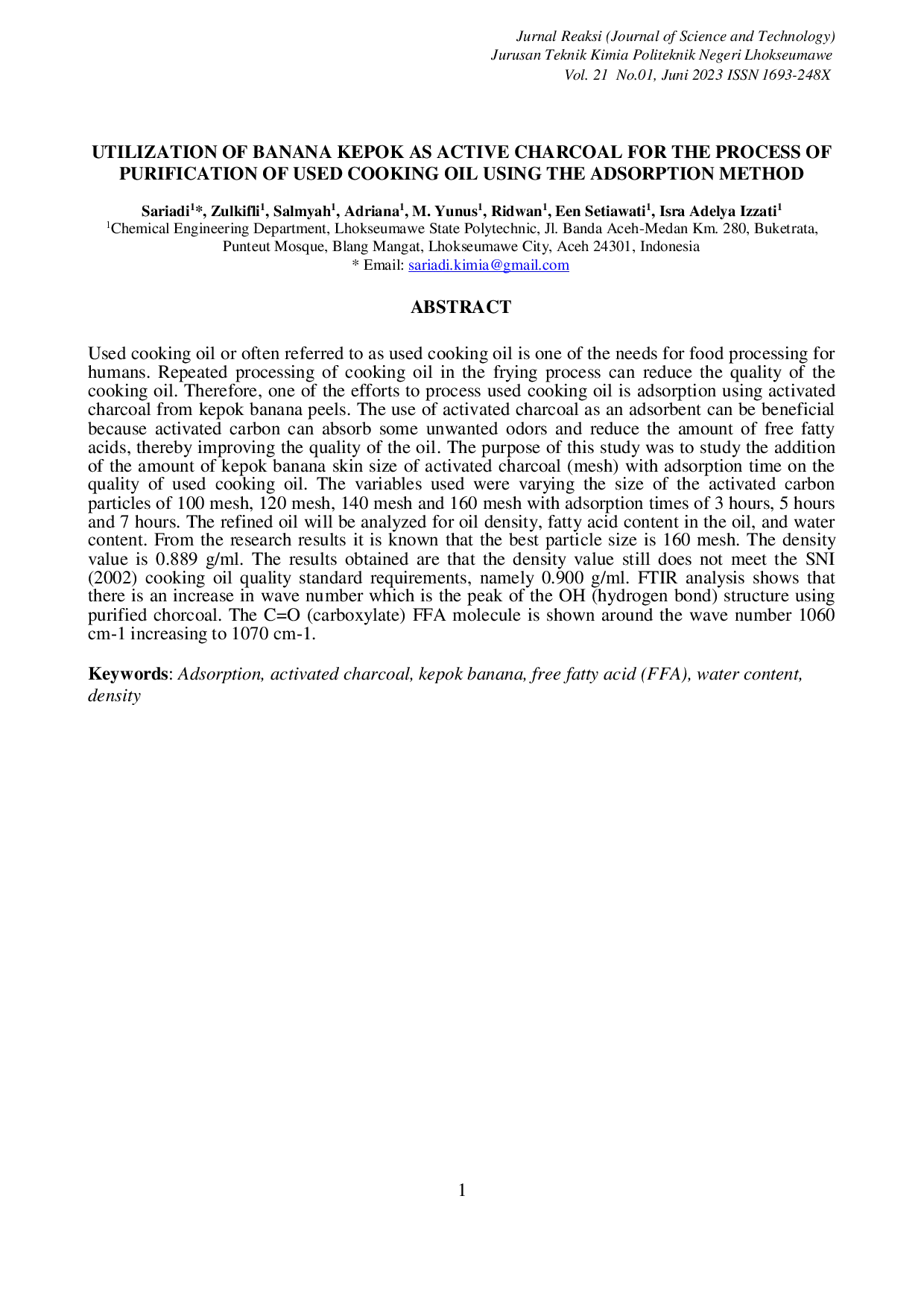 Jurnal Sains dan Teknologi ReaksiJurnal Sains dan Teknologi ReaksiMinyak goreng bekas atau sering disebut minyak jelantah merupakan salah satu kebutuhan dalam pengolahan makanan bagi manusia. Pengolahan minyak goreng secara berulang dalam proses penggorengan dapat menurunkan kualitas minyak goreng tersebut. Oleh karena itu, salah satu upaya untuk mengolah minyak goreng bekas adalah dengan adsorpsi menggunakan arang aktif dari kulit pisang kepok. Penggunaan arang aktif sebagai adsorben dapat bermanfaat karena karbon aktif mampu menyerap bau yang tidak diinginkan dan mengurangi kadar asam lemak bebas, sehingga meningkatkan kualitas minyak. Tujuan penelitian ini adalah untuk mengkaji pengaruh penambahan jumlah ukuran partikel arang aktif kulit pisang kepok (mesh) dengan waktu adsorpsi terhadap kualitas minyak goreng bekas. Variabel yang digunakan adalah variasi ukuran partikel karbon aktif yaitu 100 mesh, 120 mesh, 140 mesh, dan 160 mesh dengan waktu adsorpsi 3 jam, 5 jam, dan 7 jam. Minyak hasil pemurnian dianalisis densitas minyak, kadar asam lemak dalam minyak, dan kadar air. Dari hasil penelitian diketahui bahwa ukuran partikel terbaik adalah 160 mesh. Nilai densitas yang diperoleh adalah 0,889 g/ml. Hasil ini menunjukkan bahwa nilai densitas masih belum memenuhi persyaratan standar mutu minyak goreng SNI (2002), yaitu 0,900 g/ml. Analisis FTIR menunjukkan adanya peningkatan bilangan gelombang yang merupakan puncak struktur OH (ikatan hidrogen) menggunakan arang yang dimurnikan. Molekul C=O (karboksilat) pada Asam Lemak Bebas (ALB) ditunjukkan di sekitar bilangan gelombang 1060 cm-1 yang meningkat menjadi 1070 cm-1.