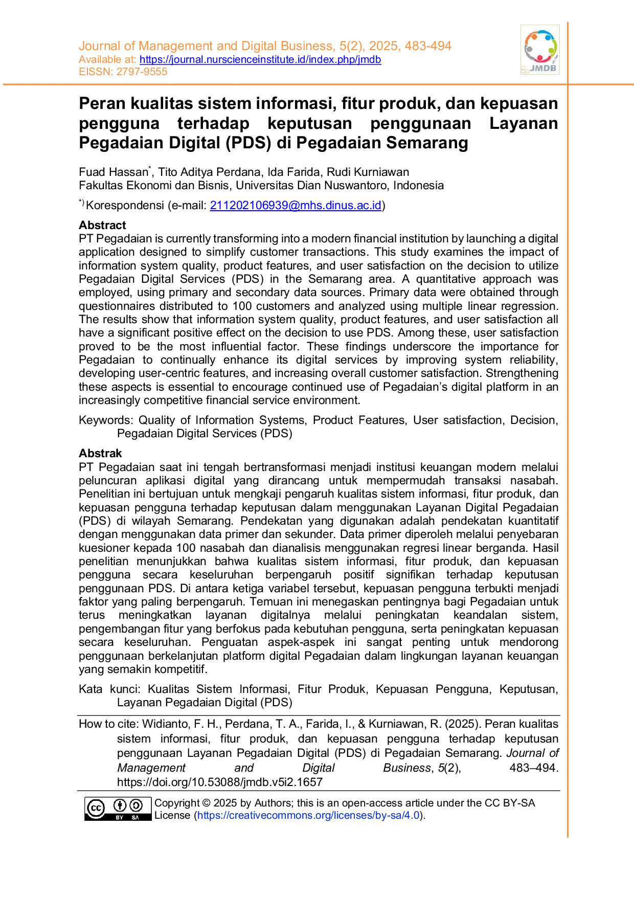 Journal of Management and Digital BusinessJournal of Management and Digital BusinessPT Pegadaian saat ini tengah bertransformasi menjadi institusi keuangan modern melalui peluncuran aplikasi digital yang dirancang untuk mempermudah transaksi nasabah. Penelitian ini bertujuan untuk mengkaji pengaruh kualitas sistem informasi, fitur produk, dan kepuasan pengguna terhadap keputusan dalam menggunakan Layanan Digital Pegadaian (PDS) di wilayah Semarang. Pendekatan yang digunakan adalah pendekatan kuantitatif dengan menggunakan data primer dan sekunder. Data primer diperoleh melalui penyebaran kuesioner kepada 100 nasabah dan dianalisis menggunakan regresi linear berganda. Hasil penelitian menunjukkan bahwa kualitas sistem informasi, fitur produk, dan kepuasan pengguna secara keseluruhan berpengaruh positif signifikan terhadap keputusan penggunaan PDS. Di antara ketiga variabel tersebut, kepuasan pengguna terbukti menjadi faktor yang paling berpengaruh. Temuan ini menegaskan pentingnya bagi Pegadaian untuk terus meningkatkan layanan digitalnya melalui peningkatan keandalan sistem, pengembangan fitur yang berfokus pada kebutuhan pengguna, serta peningkatan kepuasan secara keseluruhan.