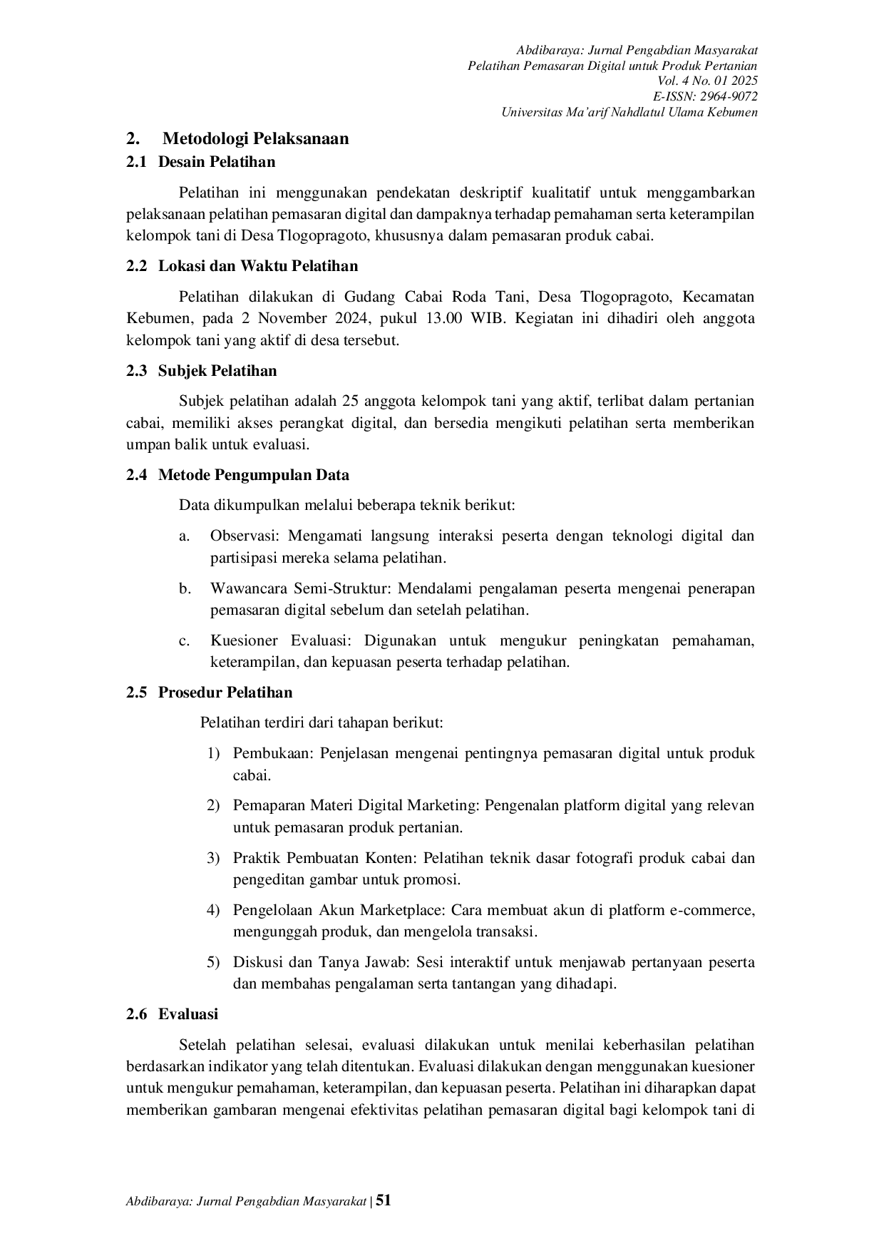 AbdibarayaAbdibarayaPelatihan ini bertujuan untuk mengevaluasi efektivitas pelatihan pemasaran digital bagi petani di Desa Tlogopragoto, Kebumen, khususnya dalam meningkatkan pengetahuan dan keterampilan mereka dalam memanfaatkan platform digital untuk memasarkan produk cabai. Pelatihan ini menggunakan pendekatan deskriptif kualitatif, dilaksanakan pada 2 November 2024, di Gudang Cabai Roda Tani. Sebanyak 25 peserta, anggota berbagai kelompok tani, menghadiri sesi pelatihan. Data dikumpulkan melalui observasi langsung, wawancara semi terstruktur, kuesioner evaluasi, dan dokumentasi. Program pelatihan terdiri dari persiapan pra-pelatihan, lokakarya pemasaran digital, dan dukungan pasca-pelatihan. Hasil penelitian menunjukkan adanya peningkatan signifikan dalam pemahaman petani terhadap perangkat pemasaran digital, termasuk platform media sosial, e-commerce, dan pembuatan konten untuk promosi produk. Peserta menunjukkan peningkatan kepercayaan diri dalam mengelola aktivitas pemasaran digital, seperti membuat konten promosi dan menggunakan platform daring untuk penjualan. Evaluasi mengungkapkan bahwa petani merasa puas dengan konten pelatihan, metodologi, dan aplikasi praktis. Studi ini menyimpulkan bahwa pelatihan pemasaran digital efektif dalam meningkatkan kemampuan petani untuk memasarkan produk pertanian mereka, yang dapat menghasilkan peluang ekonomi yang lebih baik bagi masyarakat petani di Tlogopragoto. Inisiatif di masa mendatang harus berfokus pada dukungan berkelanjutan dan pelatihan lanjutan untuk memastikan penerapan pemasaran digital yang berkelanjutan.