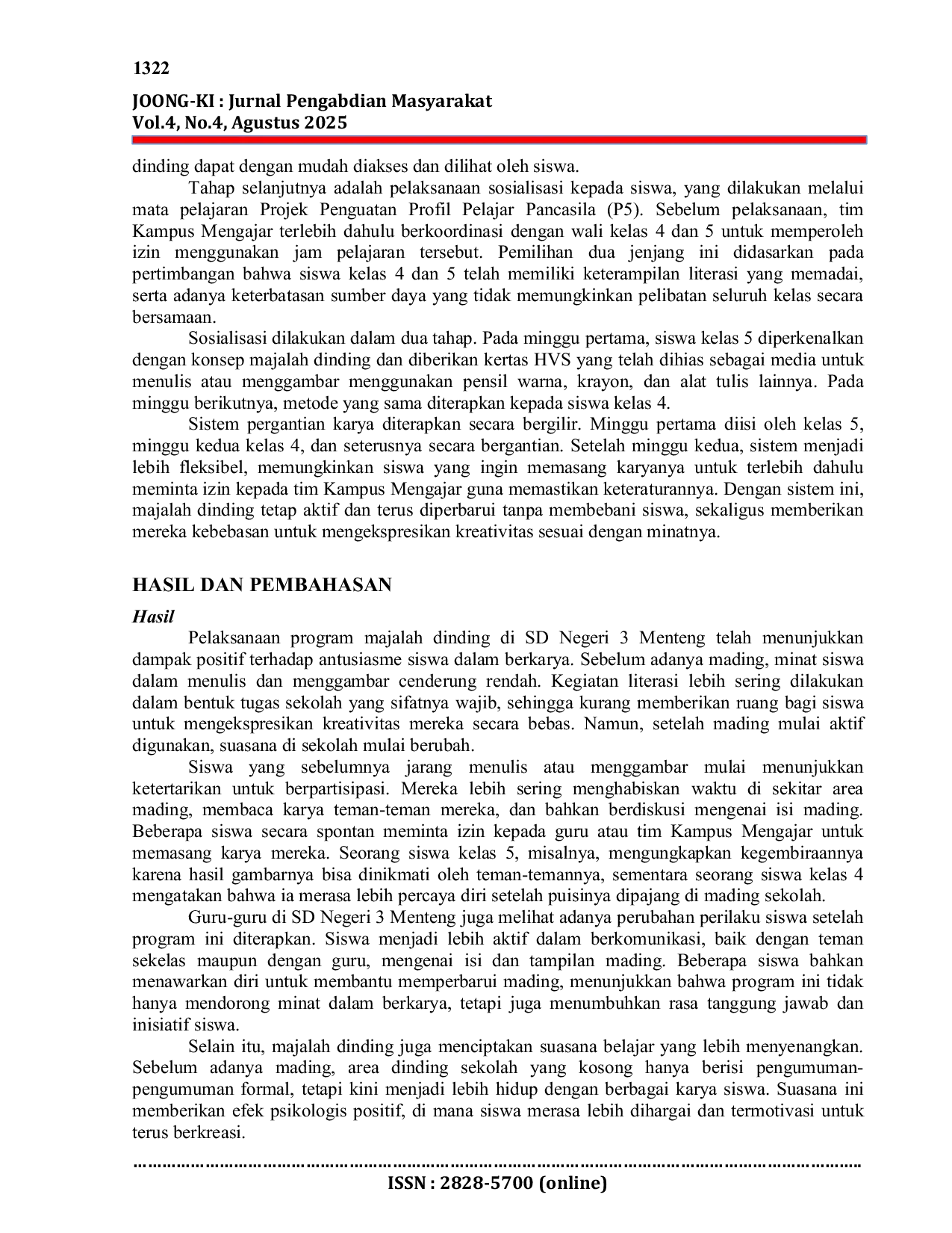 Joong-Ki : Jurnal Pengabdian MasyarakatJoong-Ki : Jurnal Pengabdian MasyarakatProgram majalah dinding (mading) di SD Negeri 3 Menteng dilatarbelakangi oleh kurangnya media apresiasi bagi karya siswa. Pengabdian ini bertujuan mendorong antusiasme dan kepercayaan diri siswa dalam berkarya melalui media majalah dinding. Kegiatan dilaksanakan melalui pembuatan media dari papan bekas, sosialisasi kepada siswa, pembuatan produk majalah dinding oleh siswa, penjadwalan pengumpulan karya dan penataan karya secara bergilir. Berdasarkan pengamatan siswa langsung, kegiatan ini tampak meningkatkan minat siswa dalam menulis dan menggambar, serta tercipta interaksi sosial positif di sekitar area majalah dinding. Walaupun terdapat tantangan dan keterbatasan dalam pengelolaan isi, program ini menunjukkan potensi besar sebagai sarana ekspresi dan apresiasi karya siswa.