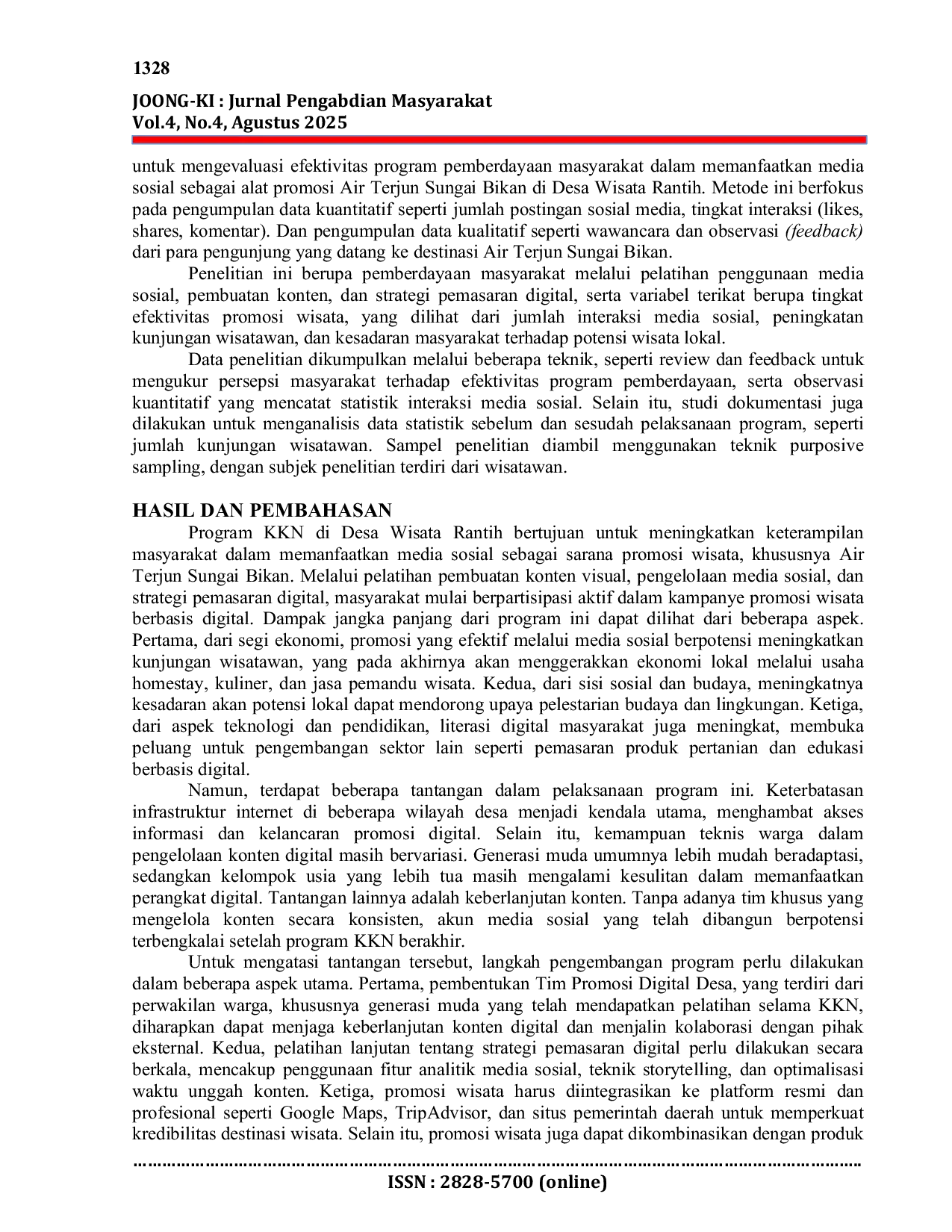 Joong-Ki : Jurnal Pengabdian MasyarakatJoong-Ki : Jurnal Pengabdian MasyarakatProgram Kuliah Kerja Nyata (KKN) di Desa Wisata Rantih, Kota Sawahlunto, bertujuan untuk memberdayakan masyarakat dalam memanfaatkan media sosial sebagai sarana promosi wisata, khususnya Air Terjun Sungai Bikan. Kegiatan ini dilaksanakan melalui pelatihan pembuatan konten digital, pengelolaan akun media sosial, dan strategi pemasaran digital. Metode penelitian yang digunakan adalah mixed methods, menggabungkan data kuantitatif dan kualitatif untuk mengevaluasi efektivitas promosi digital. Hasilnya menunjukkan peningkatan interaksi media sosial dan kunjungan wisatawan secara signifikan. Tantangan utama dalam program ini adalah keterbatasan infrastruktur digital dan keberlanjutan produksi konten. Namun, program ini mencakup peningkatan ekonomi lokal, pelestarian budaya, dan peningkatan literasi digital masyarakat. Dengan pembentukan tim promosi desa dan integrasi dengan platform nasional, Desa Rantih berpotensi menjadi model desa wisata digital berbasis pemberdayaan masyarakat yang berkelanjutan.