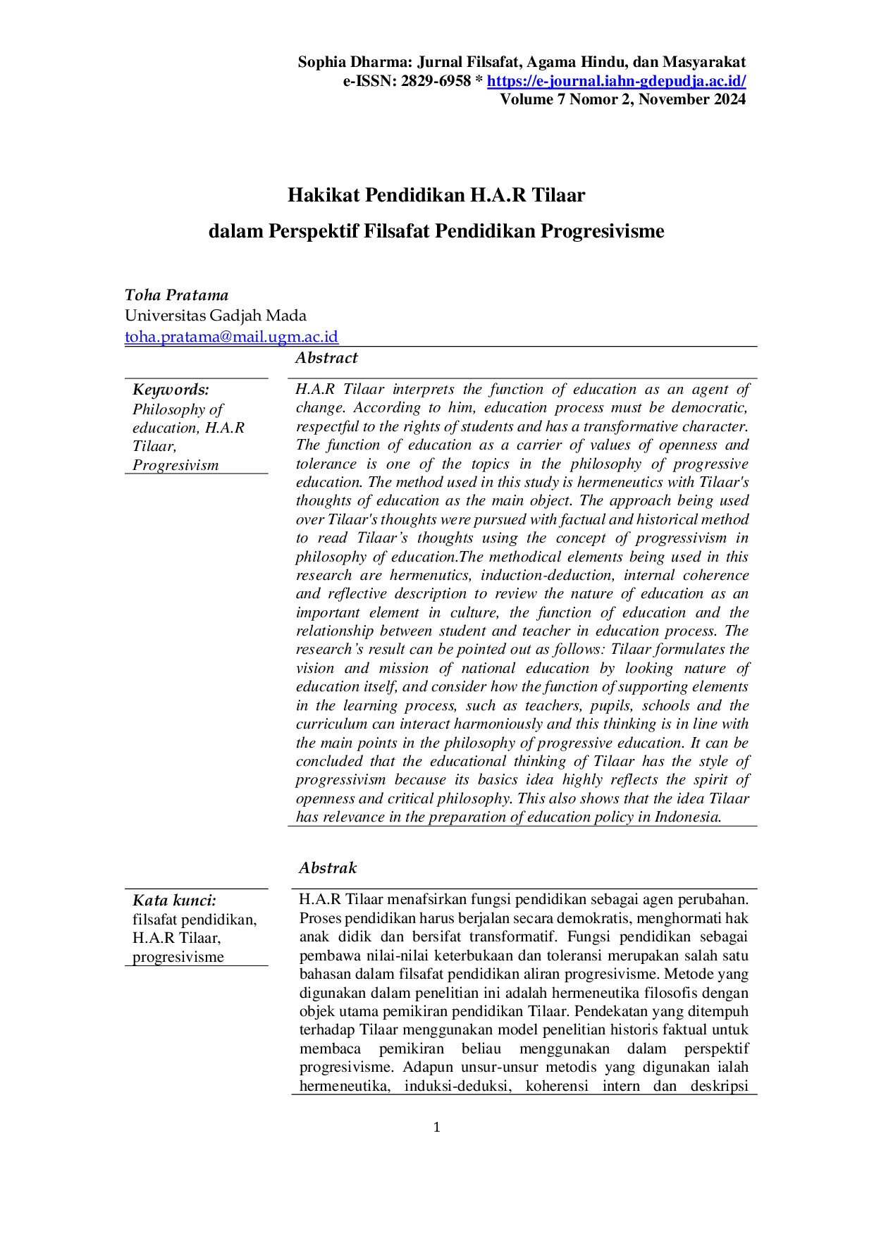 Sophia Dharma: Jurnal Filsafat, Agama Hindu, dan MasyarakatSophia Dharma: Jurnal Filsafat, Agama Hindu, dan MasyarakatH.A.R Tilaar menafsirkan fungsi pendidikan sebagai agen perubahan. Proses pendidikan harus berjalan secara demokratis, menghormati hak anak didik dan bersifat transformatif. Fungsi pendidikan sebagai pembawa nilai-nilai keterbukaan dan toleransi merupakan salah satu bahasan dalam filsafat pendidikan aliran progresivisme. Metode yang digunakan dalam penelitian ini adalah hermeneutika filosofis dengan objek utama pemikiran pendidikan Tilaar. Pendekatan yang ditempuh terhadap Tilaar menggunakan model penelitian historis faktual untuk membaca pemikiran beliau menggunakan dalam perspektif progresivisme. Adapun unsur-unsur metodis yang digunakan ialah intern dan deskripsi hermeneutika, induksi-deduksi, koherensi reflektif untuk meninjau hakikat pendidikan sebagai unsur penting dalam kebudayaan, fungsi pendidikan dan relasi guru murid dalam proses pendidikan. Hasil penelitian ini dapat dijelaskan sebagai berikut: Tilaar merumuskan visi dan misi pendidikan nasional dengan mencari hakikat pendidikan itu sendiri serta memikirkan bagaimana fungsi elemen-elemen pendukung dalam proses pembelajaran seperti guru, murid, sekolah dan kurikulum dapat saling berinteraksi dengan harmonis dan pemikiran ini sangat sejalan dengan pokok-pokok utama dalam filsafat pendidikan aliran progresivisme. Akhirnya dapat disimpulkan bahwa pemikiran pendidikan Tilaar memiliki corak sangat dasar-dasar aliran progresivisme utamanya karena dasar-dasarnya mencerminkan semangat keterbukaan dan kritis.