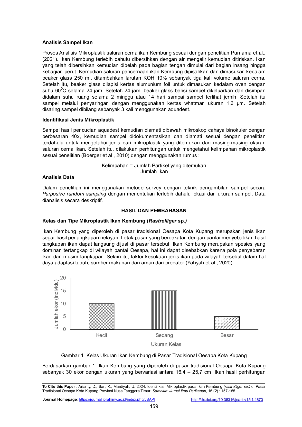 Samakia : Jurnal Ilmu PerikananSamakia : Jurnal Ilmu PerikananPasar tradisional Oesapa terletak di kelurahan Oesapa selatan, kecamatan Kelapa Lima Kota Kupang. Letak pasar Oesapa berdekatan dengan laut sehingga banyak sekali aktivitas masyarakat yang menghasilkan peningkatan sampah atau limbah seperti plastik kemasan, botol-botol minuman, makanan sisa dan limbah ikan hasil penjualan. Sampah plastik dapat terurai menjadi partikel kecil yang disebut mikroplastik dan dapat terdistribusi pada bagian kolom air sehingga tanpa disengaja tertelan oleh ikan-ikan salah satunya ikan Kembung (Rastrelliger sp). Tujuan penelitian ini untuk mengidentifikasi tipe dan kelimpahan mikroplastik pada saluran pencernaan ikan Kembung yang dijual di pasar tradisional Oesapa Kota Kupang. Design penelitian ini adalah deskriptif kualitatif dengan melakukan survey langsung dan mengambil sampel ikan dari beberapa tempat penjualan di Pasar tradisional Oesapa. Pengambilan sampel sebanyak 30 ekor yang berukuran 16,4 – 25,7 cm dibagi menjadi tiga kelas. Hasil penelitian menunjukkan bahwa saluran pencernaan ikan Kembung pada tiap kelas mengandung tipe film, granule, fragment dan fiber. Pada kelas ketiga ukuran (23,6-25,7 cm) menghasilkan total mikroplastik tertinggi yaitu 3,40 partikel/ind. Sedangkan dari semua kelas ikan, tipe mikroplastik fragment menghasilkan nilai rata-rata kelimpahan tertinggi yaitu 0,69 0,57 partikel/ind.