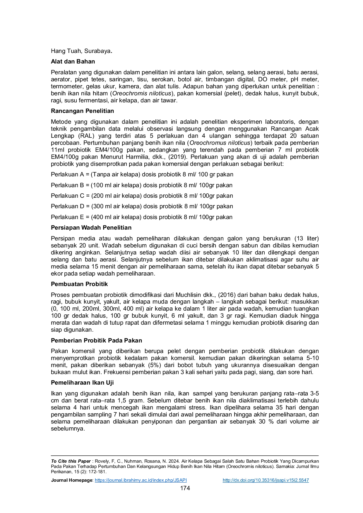 Penelitian ini menyimpulkan bahwa perbedaan penambahan air kelapa dalam probiotik yang dicampurkan dalam pakan tidak berpengaruh nyata terhadap pertumbuhan berat mutlak, panjang mutlak, dan kelangsungan hidup benih ikan nila hitam.Pertumbuhan berat mutlak tertinggi diperoleh pada perlakuan E (5,47 gram), pertumbuhan panjang mutlak tertinggi pada perlakuan A (3,17 cm), dan kelangsungan hidup tertinggi juga pada perlakuan A (95%).Kualitas air selama penelitian tetap dalam kondisi optimal untuk ikan nila.