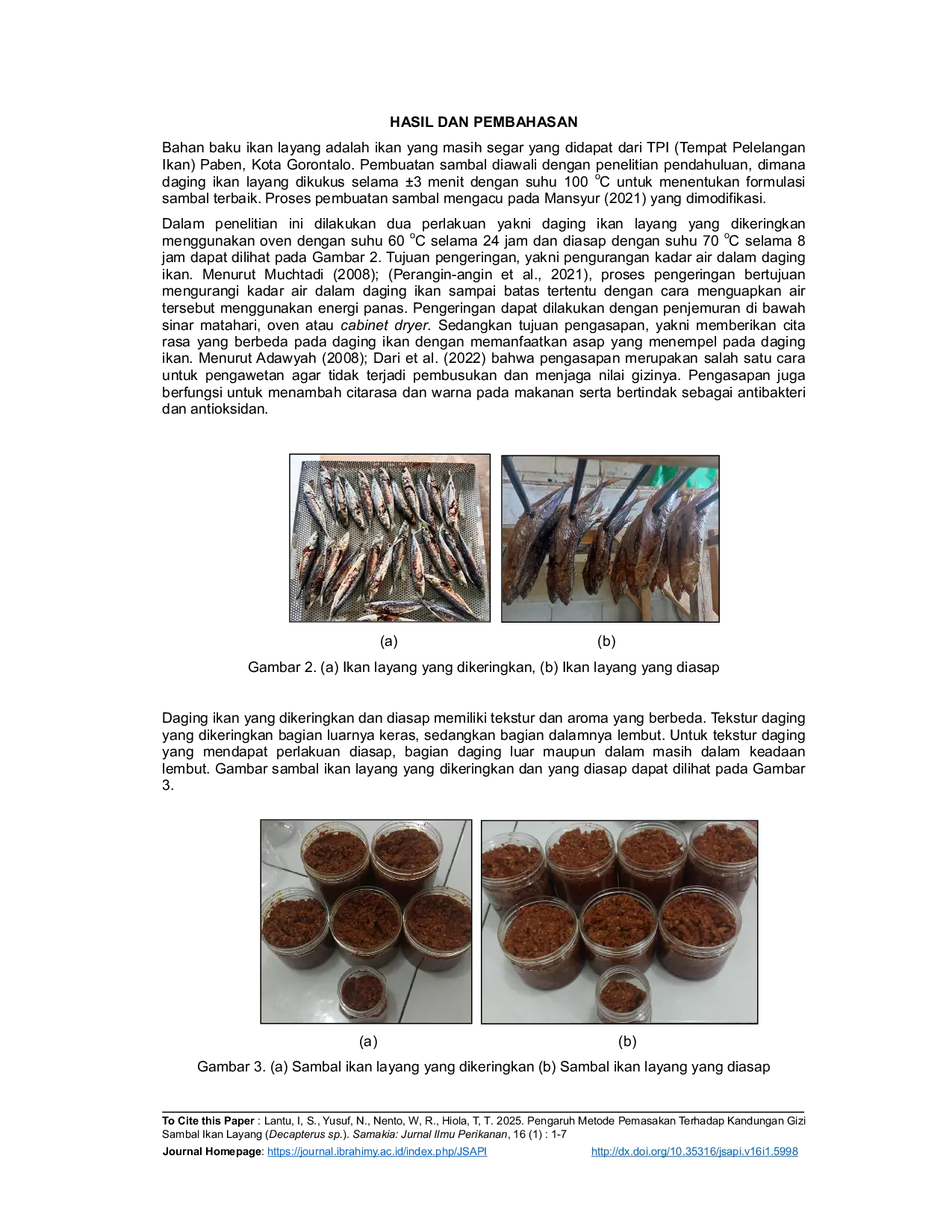 Metode pengolahan pengeringan dan pengasapan tidak memberikan pengaruh signifikan terhadap kandungan protein dan lemak sambal ikan layang.Secara sensori, panelis lebih menyukai sambal ikan layang yang dikeringkan dibandingkan yang diasap.Kualitas sensori sambal ikan layang dipengaruhi oleh tekstur, aroma, rasa, dan penampakan yang dihasilkan dari masing-masing metode pengolahan.