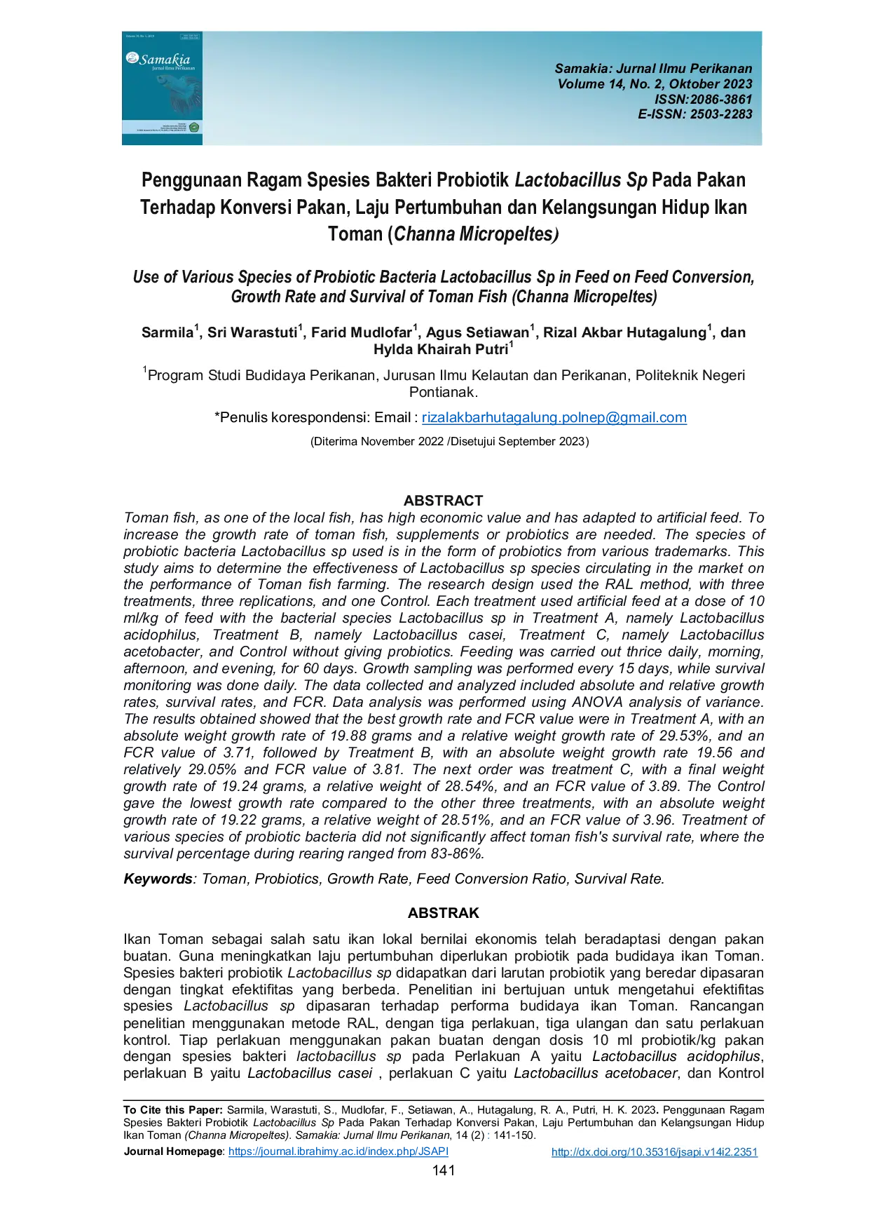 Samakia : Jurnal Ilmu PerikananSamakia : Jurnal Ilmu PerikananIkan Toman sebagai salah satu ikan lokal bernilai ekonomis telah beradaptasi dengan pakan buatan. Guna meningkatkan laju pertumbuhan diperlukan probiotik pada budidaya ikan Toman. Spesies bakteri probiotik Lactobacillus sp didapatkan dari larutan probiotik yang beredar dipasaran dengan tingkat efektifitas yang berbeda. Penelitian ini bertujuan untuk mengetahui efektifitas spesies Lactobacillus sp dipasaran terhadap performa budidaya ikan Toman. Rancangan penelitian menggunakan metode RAL, dengan tiga perlakuan, tiga ulangan dan satu perlakuan kontrol. Tiap perlakuan menggunakan pakan buatan dengan dosis 10 ml probiotik/kg pakan dengan spesies bakteri lactobacillus sp pada Perlakuan A yaitu Lactobacillus acidophilus, perlakuan B yaitu Lactobacillus casei , perlakuan C yaitu Lactobacillus acetobacer, dan Kontrol tanpa probiotik. Pemberian pakan 3 kali dengan lama pengamatan selama 60 hari. Sampling pertumbuhan dilakukan setiap 15 hari sedangkan pengamatan kelangsungan hidup dilakukan tiap hari. Analisis data meliputi laju pertumbuhan mencakup mutlak dan relatif, tingkat kelangsungan hidup, dan FCR.Hasil yang diperoleh menunjukan laju pertumbuhan dan nilai FCR yang terbaik pada perlakuan A dengan laju pertumbuhan berat mutlak 19,88 gram, laju pertumbuhan berat relatif 29,53%, dan nilai FCR 3,71, selanjutnya perlakuan B dengan laju pertumbuhan berat mutlak 19,56 dan relatif 29,05% serta nilai FCR 3,81, berikutnya perlakuan C dengan laju pertumbuhan berat mutlak 19,24 gram dan relative 28,54% serta nilai FCR 3,89. Kontrol menunjukkan laju pertumbuhan mutlak 19,22 gram dan relatif 28,51% serta nilai FCR 3.96. Perlakuan pemberian ragam spesies bakteri probiotik tidak mempengaruhi kelangsungan hidup ikan toman, dimana nilai prosentase kelangsungan hidup selama pemeliharaan berkisar antara 83-86%.