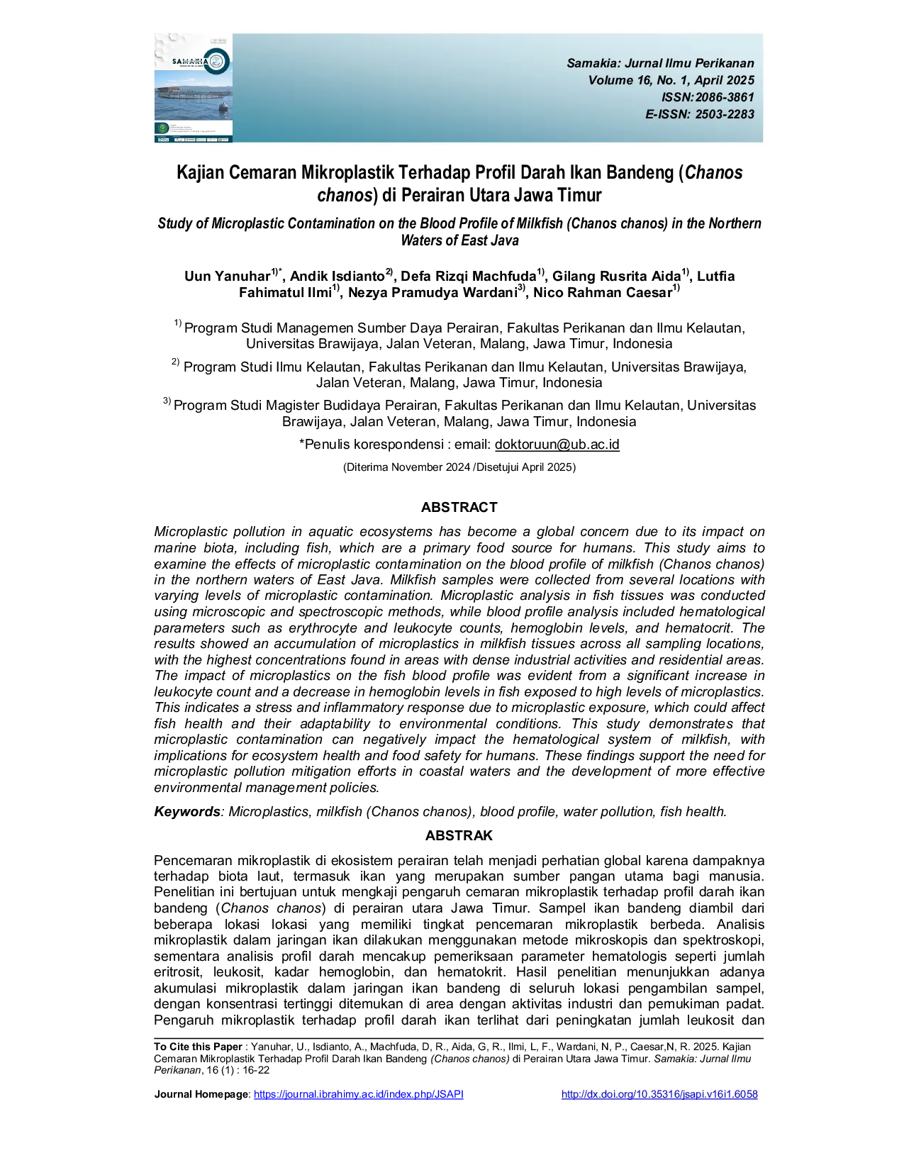 Samakia : Jurnal Ilmu PerikananSamakia : Jurnal Ilmu PerikananPencemaran mikroplastik di ekosistem perairan telah menjadi perhatian global karena dampaknya terhadap biota laut, termasuk ikan yang merupakan sumber pangan utama bagi manusia. Penelitian ini bertujuan untuk mengkaji pengaruh cemaran mikroplastik terhadap profil darah ikan bandeng (Chanos chanos) di perairan utara Jawa Timur. Sampel ikan bandeng diambil dari beberapa lokasi tingkat pencemaran mikroplastik berbeda. Analisis mikroplastik dalam jaringan ikan dilakukan menggunakan metode mikroskopis dan spektroskopi, sementara analisis profil darah mencakup pemeriksaan parameter hematologis seperti jumlah eritrosit, leukosit, kadar hemoglobin, dan hematokrit. Hasil penelitian menunjukkan adanya akumulasi mikroplastik dalam jaringan ikan bandeng di seluruh lokasi pengambilan sampel, dengan konsentrasi tertinggi ditemukan di area dengan aktivitas industri dan pemukiman padat. Pengaruh mikroplastik terhadap profil darah ikan terlihat dari peningkatan jumlah leukosit dan penurunan kadar hemoglobin yang signifikan pada ikan yang terpapar mikroplastik dalam jumlah tinggi. Hal ini mengindikasikan adanya respon stres dan inflamasi akibat paparan mikroplastik, yang berpotensi memengaruhi kesehatan ikan dan kemampuan adaptasinya terhadap kondisi lingkungan. Penelitian ini menunjukkan bahwa cemaran mikroplastik dapat berdampak negatif pada sistem hematologi ikan bandeng, yang berimplikasi pada kesehatan ekosistem dan keamanan pangan bagi manusia. Temuan ini mendukung perlunya tindakan mitigasi pencemaran mikroplastik di perairan pesisir serta pengembangan kebijakan pengelolaan lingkungan yang lebih efektif.