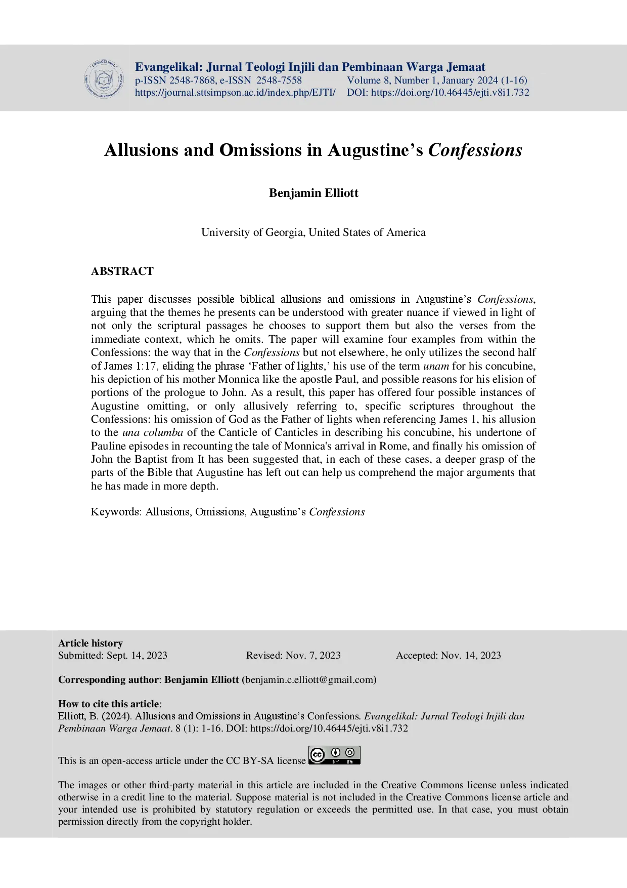 Evangelikal: Jurnal Teologi InjiliEvangelikal: Jurnal Teologi InjiliMakalah ini membahas kemungkinan alusi dan penghilangan alkitabiah dalam Pengakuan Agustinus, dengan argumentasi bahwa tema-tema yang ia presentasikan dapat dipahami dengan nuansa yang lebih besar jika dilihat dari sudut pandang tidak hanya bagian-bagian kitab suci yang ia pilih untuk mendukungnya, tetapi juga ayat-ayat dari konteks langsung, yang ia hilangkan. Makalah ini akan menguji empat contoh dari dalam Pengakuan: cara yang dalam Pengakuan tetapi tidak di tempat lain, ia hanya memanfaatkan bagian kedua dari Yakobus 1:17, menghilangkan frasa Bapa segala terang, penggunaannya istilah unam untuk selirnya, penggambaran ibunya Monnica seperti rasul Paulus, dan kemungkinan alasan penghilangannya atas bagian-bagian dari prolog untuk Yohanes. Sebagai hasilnya, makalah ini telah menawarkan empat kemungkinan contoh Agustinus menghilangkan, atau hanya secara tidak langsung merujuk pada, kitab suci tertentu di seluruh Pengakuan: penghilangannya akan Tuhan sebagai Bapa segala terang ketika mereferensikan Yakobus 1, alusinya pada una columba dari Kidung Agung dalam menggambarkan selirnya, nada dasarnya dari episode-episode Pauline dalam menceritakan kisah kedatangan Monnica di Roma, dan akhirnya penghilangannya akan Yohanes Pembaptis dari Telah disarankan bahwa, dalam setiap kasus ini, pemahaman yang lebih dalam tentang bagian-bagian Alkitab yang telah ditinggalkan oleh Agustinus dapat membantu kita memahami argumen utama yang telah ia buat secara lebih mendalam.