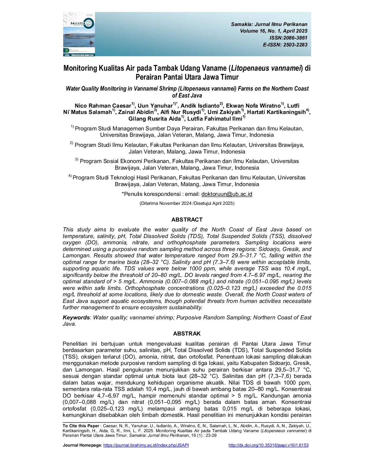 Samakia : Jurnal Ilmu PerikananSamakia : Jurnal Ilmu PerikananPenelitian ini bertujuan untuk mengevaluasi kualitas perairan di Pantai Utara Jawa Timur berdasarkan parameter suhu, salinitas, pH, Total Dissolved Solids (TDS), Total Suspended Solids (TSS), oksigen terlarut (DO), amonia, nitrat, dan ortofosfat. Penentuan lokasi sampling dilakukan menggunakan metode purposive random sampling di tiga lokasi, yaitu Kabupaten Sidoarjo, Gresik, dan Lamongan. Hasil pengukuran menunjukkan suhu perairan berkisar antara 29,5–31,7 °C, sesuai dengan standar optimal untuk biota laut (28–32 °C). Salinitas dan pH (7,3–7,6) berada dalam batas wajar, mendukung kehidupan organisme akuatik. Nilai TDS di bawah 1000 ppm, sementara rata-rata TSS adalah 10,4 mg/L, jauh di bawah ambang batas 20–80 mg/L. Konsentrasi DO berkisar 4,7–6,97 mg/L, hampir memenuhi standar optimal > 5 mg/L. Kandungan amonia (0,007–0,088 mg/L) dan nitrat (0,051–0,095 mg/L) berada dalam batas aman. Konsentrasi ortofosfat (0,025–0,123 mg/L) melampaui ambang batas 0,015 mg/L di beberapa lokasi, kemungkinan disebabkan oleh limbah domestik. Hasil penelitian ini menunjukkan kondisi perairan Pantai Utara Jawa Timur mendukung ekosistem akuatik, meskipun potensi ancaman dari aktivitas manusia memerlukan pengelolaan lebih lanjut untuk menjaga keberlanjutan ekosistem.
