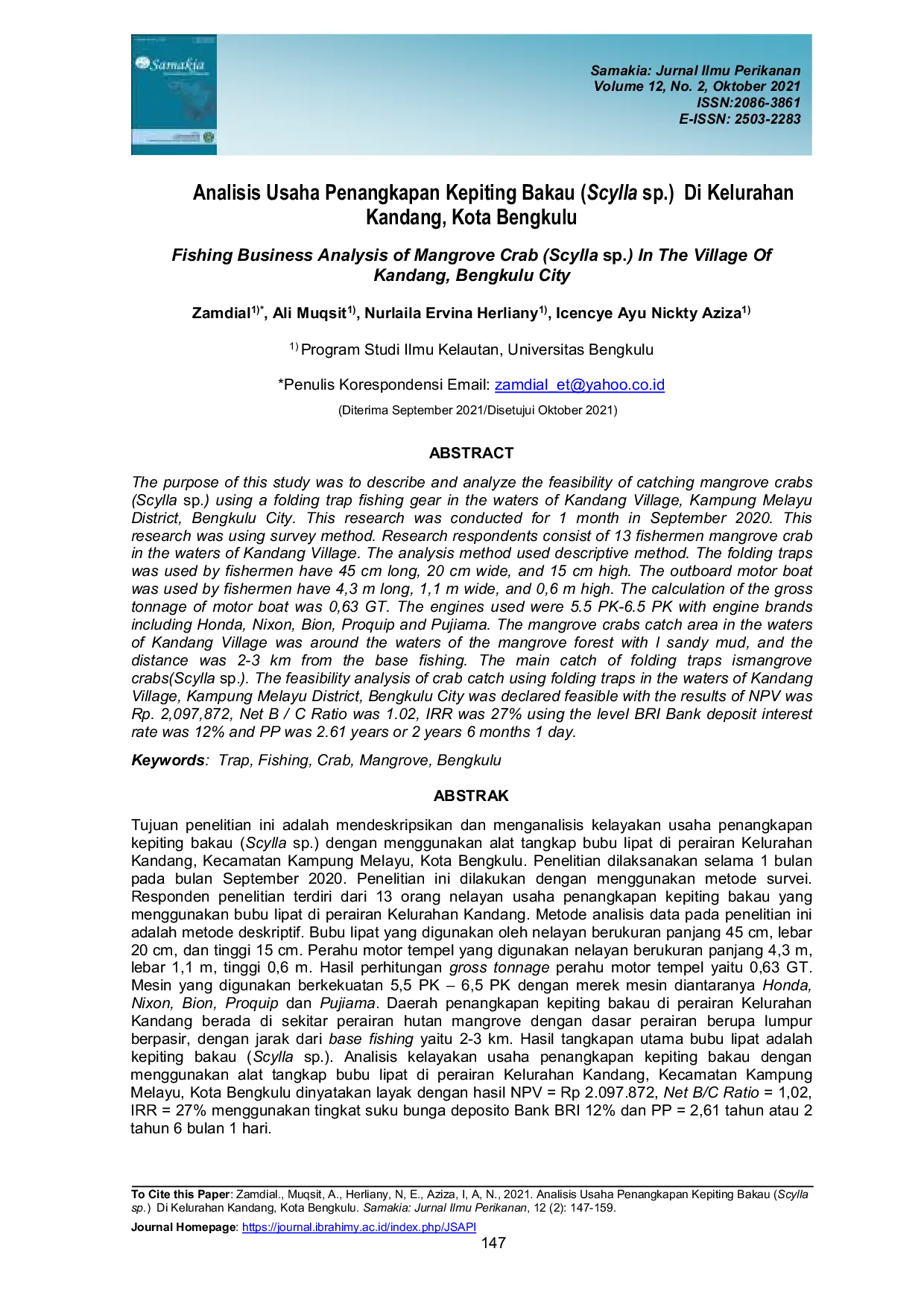 Samakia : Jurnal Ilmu PerikananSamakia : Jurnal Ilmu PerikananTujuan penelitian ini adalah mendeskripsikan dan menganalisis kelayakan usaha penangkapan kepiting bakau (Scylla sp.) dengan menggunakan alat tangkap bubu lipat di perairan Kelurahan Kandang, Kecamatan Kampung Melayu, Kota Bengkulu. Penelitian dilaksanakan selama 1 bulan pada bulan September 2020. Penelitian ini dilakukan dengan menggunakan metode survei. Responden penelitian terdiri dari 13 orang nelayan usaha penangkapan kepiting bakau yang menggunakan bubu lipat di perairan Kelurahan Kandang. Metode analisis data pada penelitian ini adalah metode deskriptif. Bubu lipat yang digunakan oleh nelayan berukuran panjang 45 cm, lebar 20 cm, dan tinggi 15 cm. Perahu motor tempel yang digunakan nelayan berukuran panjang 4,3 m, lebar 1,1 m, tinggi 0,6 m. Hasil perhitungan gross tonnage perahu motor tempel yaitu 0,63 GT. Mesin yang digunakan berkekuatan 5,5 PK – 6,5 PK dengan merek mesin diantaranya Honda, Nixon, Bion, Proquip dan Pujiama. Daerah penangkapan kepiting bakau di perairan Kelurahan Kandang berada di sekitar perairan hutan mangrove dengan dasar perairan berupa lumpur berpasir, dengan jarak dari base fishing yaitu 2-3 km. Hasil tangkapan utama bubu lipat adalah kepiting bakau (Scylla sp.). Analisis kelayakan usaha penangkapan kepiting bakau dengan menggunakan alat tangkap bubu lipat di perairan Kelurahan Kandang, Kecamatan Kampung Melayu, Kota Bengkulu dinyatakan layak dengan hasil NPV = Rp 2.097.872, Net B/C Ratio = 1,02, IRR = 27% menggunakan tingkat suku bunga deposito Bank BRI 12% dan PP = 2,61 tahun atau 2 tahun 6 bulan 1 hari.