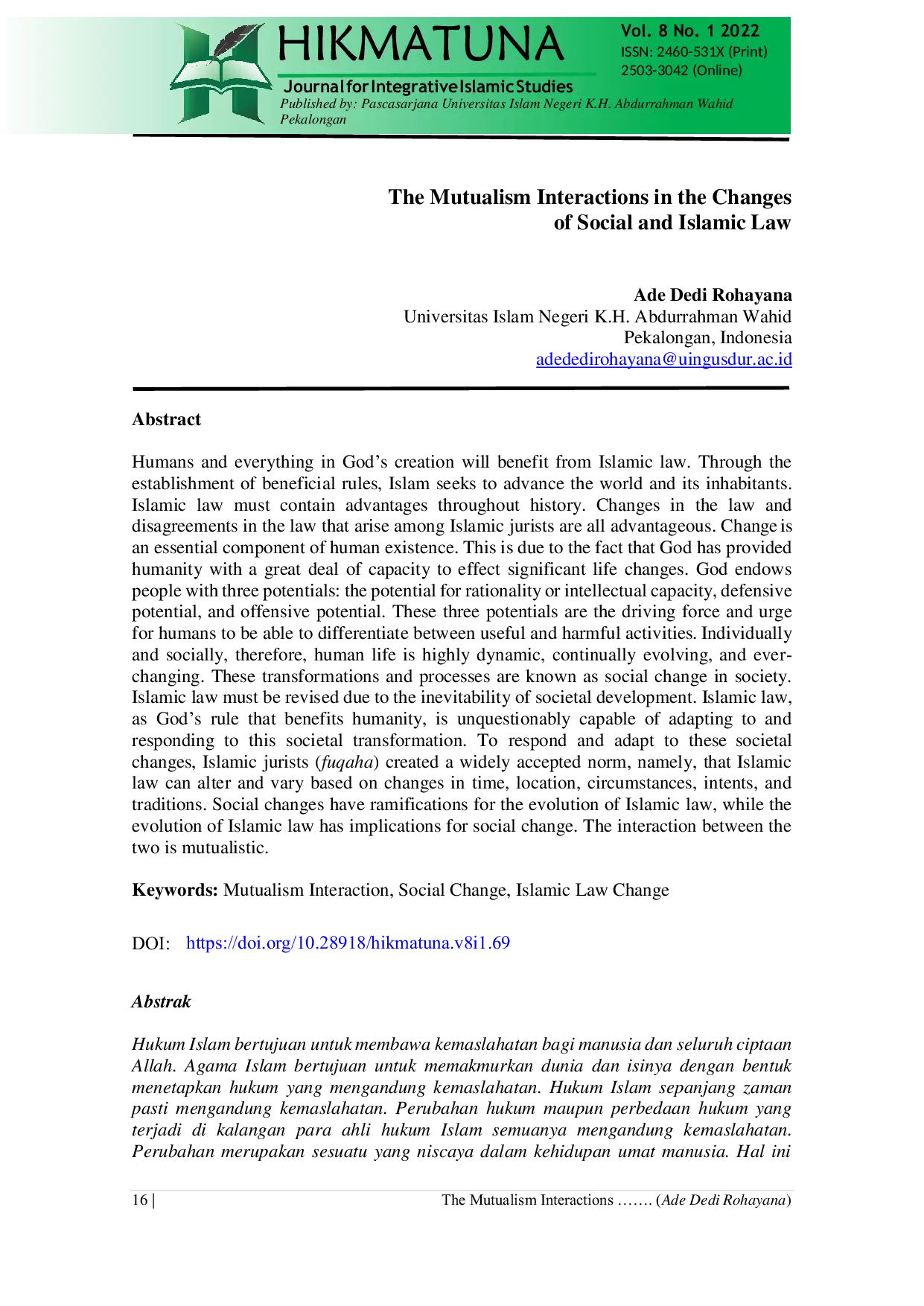 Hikmatuna : Journal for Integrative Islamic StudiesHikmatuna : Journal for Integrative Islamic StudiesHumans and everything in Gods creation will benefit from Islamic law. Through the establishment of beneficial rules, Islam seeks to advance the world and its inhabitants. Islamic law must contain advantages throughout history. Changes in the law and disagreements in the law that arise among Islamic jurists are all advantageous. Change is an essential component of human existence. This is due to the fact that God has provided humanity with a great deal of capacity to effect significant life changes. God endows people with three potentials: the potential for rationality or intellectual capacity, defensive potential, and offensive potential. These three potentials are the driving force and urge for humans to be able to differentiate between useful and harmful activities. Individually and socially, therefore, human life is highly dynamic, continually evolving, and ever-changing. These transformations and processes are known as social change in society. Islamic law must be revised due to the inevitability of societal development. Islamic law, as Gods rule that benefits humanity, is unquestionably capable of adapting to and responding to this societal transformation. To respond and adapt to these societal changes, Islamic jurists (fuqaha) created a widely accepted norm, namely, that Islamic law can alter and vary based on changes in time, location, circumstances, intents, and traditions. Social changes have ramifications for the evolution of Islamic law, while the evolution of Islamic law has implications for social change. The interaction between the two is mutualistic.