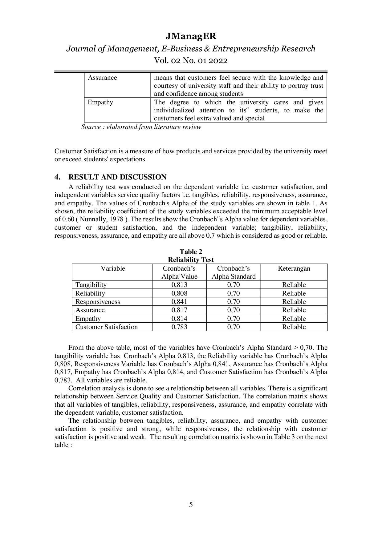 JManagERJManagERPenelitian ini bertujuan untuk menganalisis hubungan antara kualitas layanan dan kepuasan pelanggan di Universitas Katolik Musi Charitas. Hasil penelitian ini diharapkan dapat membantu manajemen dalam meningkatkan kualitas layanan dan kepuasan di antara mahasiswa, dan semoga semua variabel juga sesuai dan selaras dengan nilai-nilai universitas, yaitu CHAMPION. Sebanyak 300 kuesioner didistribusikan kepada mahasiswa dari 4 fakultas menggunakan teknik convenience sampling, tetapi hanya 214 kuesioner yang tersedia untuk diproses. Hasil penelitian menunjukkan bahwa Kualitas Layanan secara signifikan memiliki dampak positif terhadap kepuasan pelanggan sebesar 61,6%, dan sisanya 38,4% terkait dengan faktor-faktor lain.
