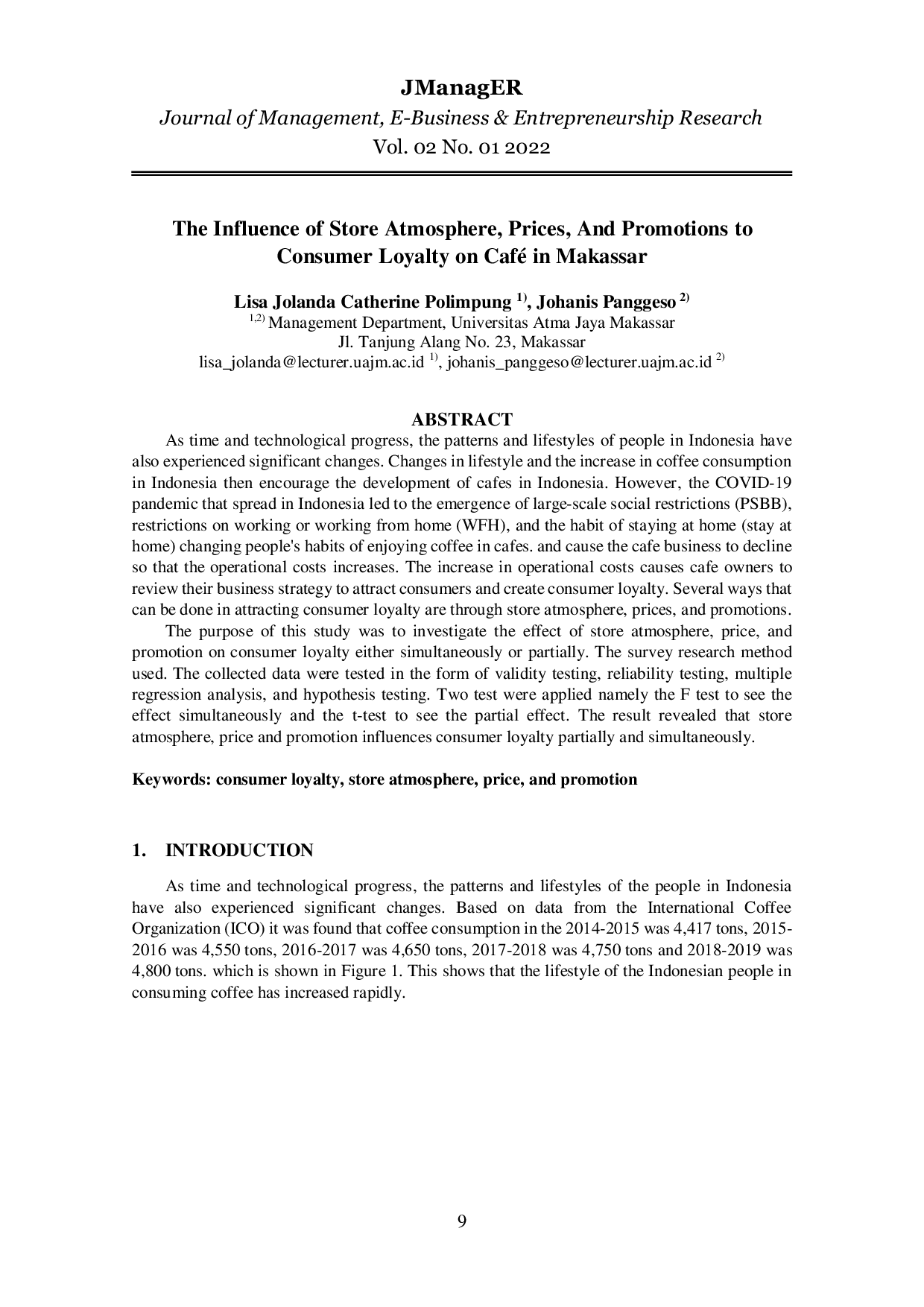 JManagERJManagERSeiring dengan kemajuan waktu dan teknologi, pola dan gaya hidup masyarakat Indonesia juga mengalami perubahan yang signifikan. Perubahan gaya hidup dan peningkatan konsumsi kopi di Indonesia mendorong perkembangan bisnis kafe di Indonesia. Namun, pandemi COVID-19 yang melanda Indonesia menyebabkan penerapan pembatasan sosial berskala besar (PSBB), pembatasan bekerja atau bekerja dari rumah (WFH), dan kebiasaan tinggal di rumah (stay at home) yang mengubah kebiasaan menikmati kopi di kafe. Hal ini menyebabkan bisnis kafe mengalami penurunan sehingga biaya operasional meningkat. Peningkatan biaya operasional menyebabkan pemilik kafe perlu meninjau strategi bisnis mereka untuk menarik kembali konsumen dan menciptakan loyalitas konsumen. Beberapa cara yang dapat dilakukan dalam menarik loyalitas konsumen adalah melalui suasana toko, harga, dan promosi.