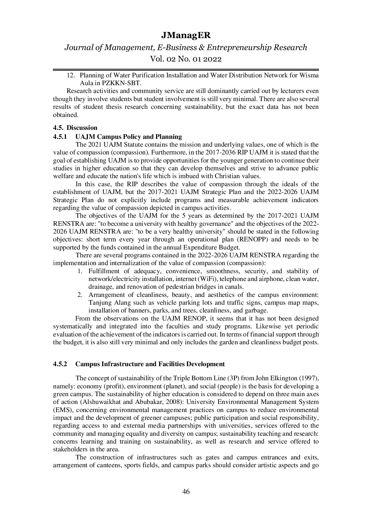 Berdasarkan hasil observasi, dapat disimpulkan bahwa UAJM masih belum siap menjadi universitas berkelanjutan meskipun kurikulum semua program studi tampaknya siap mengimplementasikan pembelajaran berkelanjutan.Hal ini disebabkan oleh beberapa faktor, antara lain kebijakan yang belum terintegrasi, dukungan anggaran yang minim, kondisi infrastruktur yang kurang terawat, kurangnya budaya kebersamaan dalam gerakan kampus hijau, dan keterbatasan penelitian ilmiah terkait keberlanjutan.Oleh karena itu, diperlukan perbaikan dalam perencanaan, penganggaran, dan implementasi program-program keberlanjutan untuk mencapai visi universitas berkelanjutan.