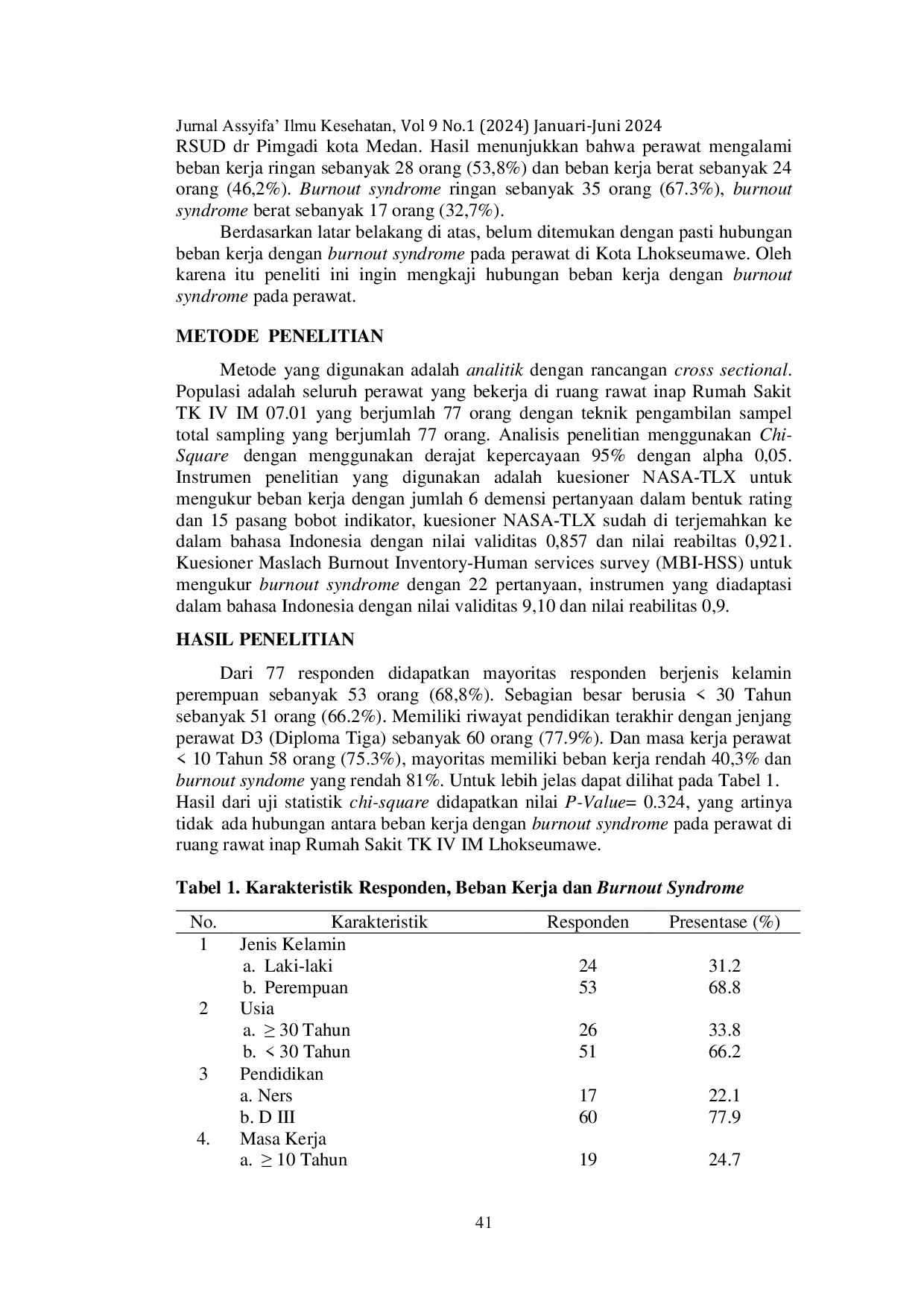Jurnal Assyifa: Jurnal Ilmu Kesehatan LhokseumaweJurnal Assyifa: Jurnal Ilmu Kesehatan LhokseumawePenelitian ini bertujuan untuk mengetahui hubungan beban kerja dengan burnout syndrome pada perawat di ruang rawat inap Rumah Sakit TK IV IM 07.01 Lhokseumawe. Metode penelitian yang digunakan adalah analitik dengan rancangan cross sectional. Populasi dalam penelitian ini adalah 77 perawat rawat inap, dengan menggunakan teknik total sampling. Hasil penelitian menunjukkan nilai p-value = 0.324, yang berarti tidak ada hubungan antara beban kerja dengan burnout syndrome pada perawat di ruang rawat inap Rumah Sakit TK IV IM Lhokseumawe. Diharapkan kepada responden agar menetapkan batasan jam bekerja, beristirahat jika lelah, dan melakukan usaha yang optimal dalam pekerjaannya.