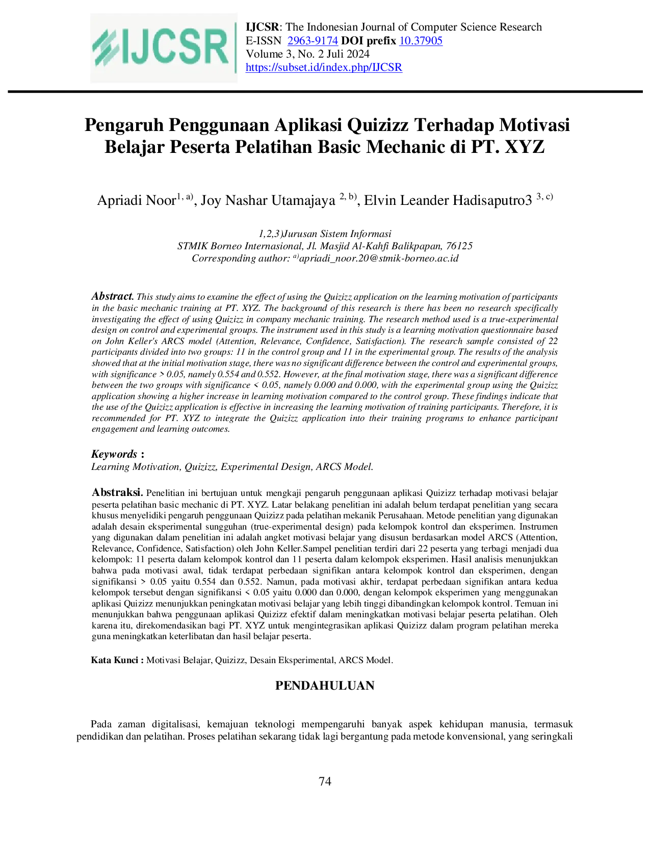 The Indonesian Journal of Computer Science ResearchThe Indonesian Journal of Computer Science ResearchPenelitian ini bertujuan untuk mengkaji pengaruh penggunaan aplikasi Quizizz terhadap motivasi belajar peserta pelatihan basic mechanic di PT. XYZ. Latar belakang penelitian ini adalah belum terdapat penelitian yang secara khusus menyelidiki pengaruh penggunaan Quizizz pada pelatihan mekanik Perusahaan. Metode penelitian yang digunakan adalah desain eksperimental sungguhan (true-experimental design) pada kelompok kontrol dan eksperimen. Instrumen yang digunakan dalam penelitian ini adalah angket motivasi belajar yang disusun berdasarkan model ARCS (Attention, Relevance, Confidence, Satisfaction) oleh John Keller. Sampel penelitian terdiri dari 22 peserta yang terbagi menjadi dua kelompok: 11 peserta dalam kelompok kontrol dan 11 peserta dalam kelompok eksperimen. Hasil analisis menunjukkan bahwa pada motivasi awal, tidak terdapat perbedaan signifikan antara kelompok kontrol dan eksperimen, dengan signifikansi > 0.05 yaitu 0.554 dan 0.552. Namun, pada motivasi akhir, terdapat perbedaan signifikan antara kedua kelompok tersebut dengan signifikansi < 0.05 yaitu 0.000 dan 0.000, dengan kelompok eksperimen yang menggunakan aplikasi Quizizz menunjukkan peningkatan motivasi belajar yang lebih tinggi dibandingkan kelompok kontrol. Temuan ini menunjukkan bahwa penggunaan aplikasi Quizizz efektif dalam meningkatkan motivasi belajar peserta pelatihan. Oleh karena itu, direkomendasikan bagi PT. XYZ untuk mengintegrasikan aplikasi Quizizz dalam program pelatihan mereka guna meningkatkan keterlibatan dan hasil belajar peserta.