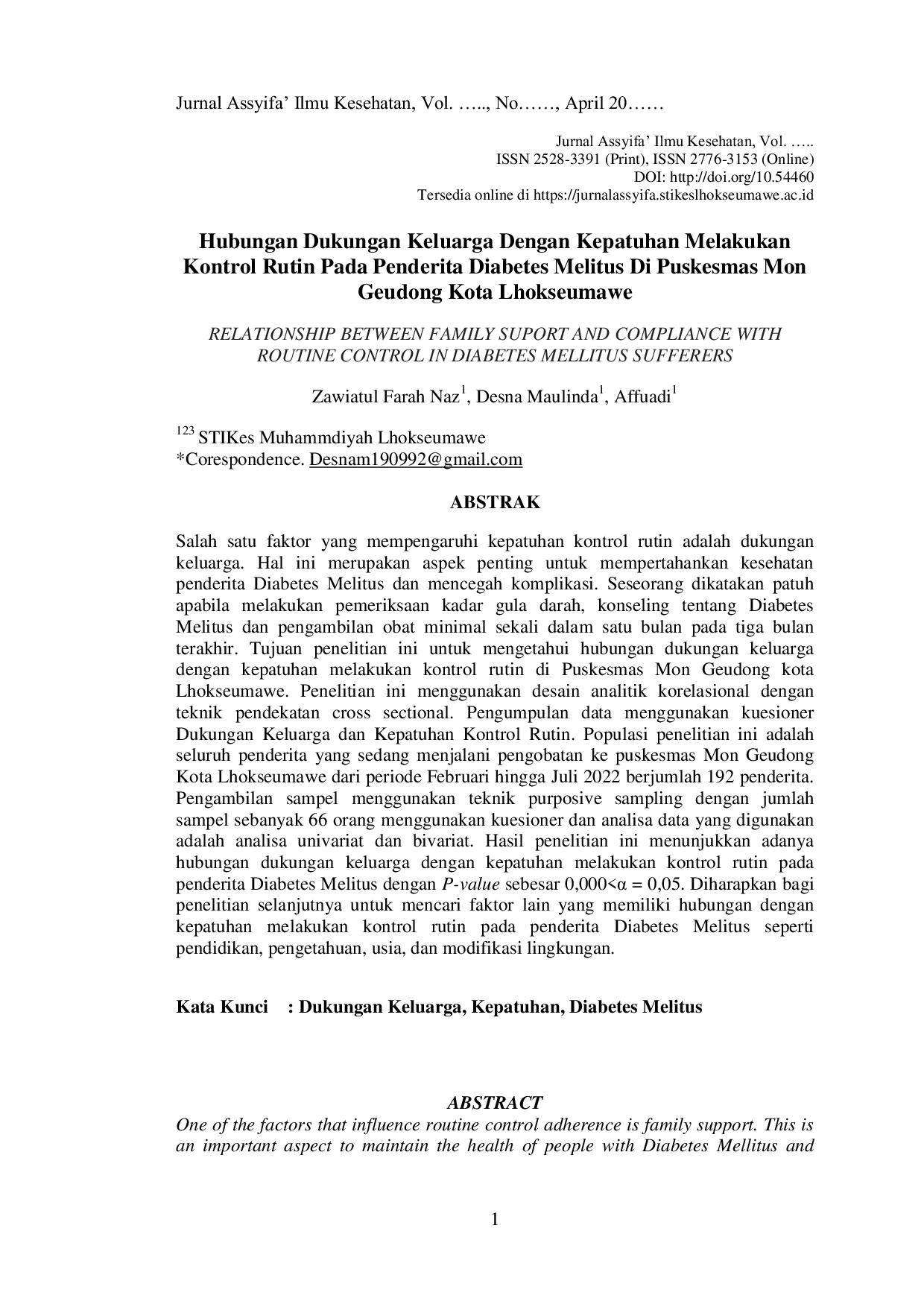 Jurnal Assyifa: Jurnal Ilmu Kesehatan LhokseumaweJurnal Assyifa: Jurnal Ilmu Kesehatan LhokseumaweSalah satu faktor yang mempengaruhi kepatuhan kontrol rutin adalah dukungan keluarga. Hal ini merupakan aspek penting untuk mempertahankan kesehatan penderita Diabetes Melitus dan mencegah komplikasi. Seseorang dikatakan patuh apabila melakukan pemeriksaan kadar gula darah, konseling tentang Diabetes Melitus dan pengambilan obat minimal sekali dalam satu bulan pada tiga bulan terakhir. Tujuan penelitian ini untuk mengetahui hubungan dukungan keluarga dengan kepatuhan melakukan kontrol rutin di Puskesmas Mon Geudong kota Lhokseumawe. Penelitian ini menggunakan desain analitik korelasional dengan teknik pendekatan cross sectional. Pengumpulan data menggunakan kuesioner Dukungan Keluarga dan Kepatuhan Kontrol Rutin. Populasi penelitian ini adalah seluruh penderita yang sedang menjalani pengobatan ke puskesmas Mon Geudong Kota Lhokseumawe dari periode Februari hingga Juli 2022 berjumlah 192 penderita. Pengambilan sampel menggunakan teknik purposive sampling dengan jumlah sampel sebanyak 66 orang menggunakan kuesioner dan analisa data yang digunakan adalah analisa univariat dan bivariat. Hasil penelitian ini menunjukkan adanya dengan P-value sebesar 0,000<α = 0,05.