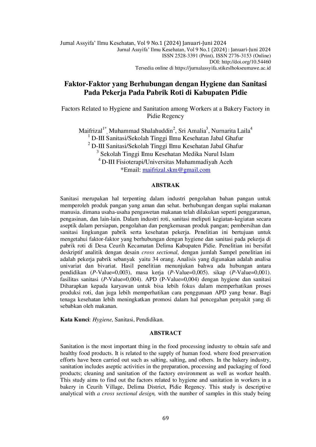 Jurnal Assyifa: Jurnal Ilmu Kesehatan LhokseumaweJurnal Assyifa: Jurnal Ilmu Kesehatan LhokseumaweSanitasi merupakan hal terpenting dalam industri pengolahan bahan pangan untuk memperoleh produk pangan yang aman dan sehat. Berhubungan dengan suplai makanan manusia. Dimana usaha-usaha pengawetan makanan telah dilakukan seperti penggaraman, pengasinan, dan lain-lain. Dalam industri roti, sanitasi meliputi kegiatan-kegiatan secara aseptik dalam persiapan, pengolahan dan pengkemasan produk pangan; pembersihan dan sanitasi lingkungan pabrik serta kesehatan pekerja. Penelitian ini bertujuan untuk mengetahui faktor-faktor yang berhubungan dengan hygiene dan sanitasi pada pekerja di pabrik roti di Desa Ceurih Kecamatan Delima Kabupaten Pidie. Penelitian ini bersifat deskriptif analitik dengan desain cross sectional, dengan jumlah Sampel penelitian ini adalah pekerja pabrik sebanyak yaitu 34 orang. Analisis yang digunakan adalah analisa univariat dan bivariat. Hasil penelitian menunjukan bahwa ada hubungan antara pendidikan (P-Value=0,003), masa kerja (P-Value=0,005). sikap (P-Value=0,001). fasilitas sanitasi (P-Value=0,004). APD (P-Value=0,004) dengan hygiene dan sanitasi. Diharapkan kepada karyawan untuk bisa lebih fokus dalam memperhatikan proses produksi roti, dan juga lebih memperhatikan cara penggunaan APD yang benar. Bagi tenaga kesehatan lebih meningkatkan promosi dalam hal pencegahan penyakit yang di sebabkan oleh makanan.
