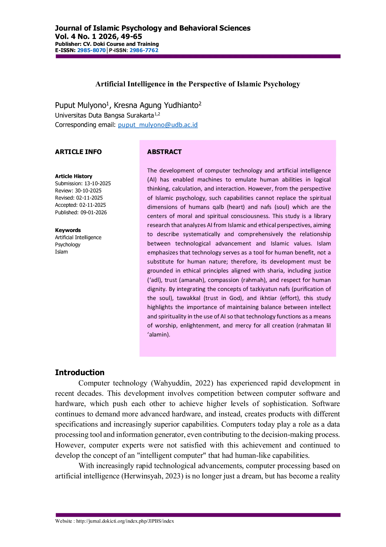 Journal of Islamic Psychology and Behavioral SciencesJournal of Islamic Psychology and Behavioral SciencesPerkembangan teknologi komputer dan kecerdasan buatan (AI) telah memungkinkan mesin meniru kemampuan manusia dalam berpikir logis, menghitung, dan berinteraksi. Namun, dari perspektif psikologi Islam, kemampuan tersebut tidak dapat menggantikan dimensi spiritual manusia, yaitu qalb (hati) dan nafs (jiwa) yang menjadi pusat kesadaran moral dan spiritual. Penelitian ini merupakan penelitian pustaka yang menganalisis AI dari sudut pandang Islam dan etika, dengan tujuan menggambarkan secara sistematis dan komprehensif hubungan antara kemajuan teknologi dengan nilai-nilai Islam. Penelitian ini menekankan bahwa teknologi harus berfungsi sebagai alat untuk kemanfaatan manusia, bukan sebagai pengganti sifat manusia; oleh karena itu, pengembangan AI harus berlandaskan prinsip-prinsip etika yang sejalan dengan syariat, termasuk keadilan (adl), kepercayaan (amanah), kasih sayang (rahmah), dan penghormatan terhadap martabat manusia. Dengan mengintegrasikan konsep-konsep tazkiyatun nafs (pembersihan jiwa), tawakkal (percaya kepada Tuhan), dan ikhtiar (usaha), penelitian ini menekankan pentingnya menjaga keseimbangan antara kecerdasan intelektual dan spiritual dalam penggunaan AI sehingga teknologi berfungsi sebagai sarana ibadah, pencerahan, dan rahmat bagi seluruh ciptaan (rahmatan lil alamin).