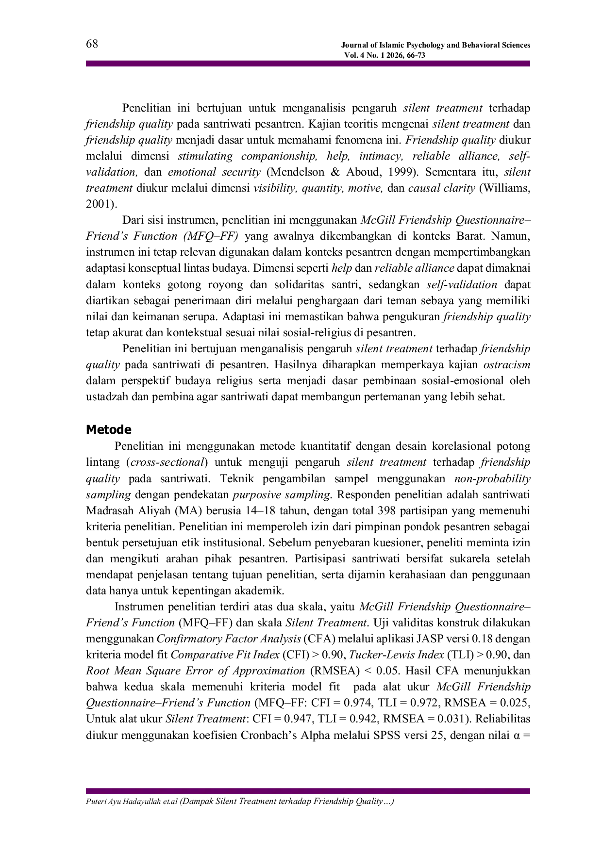 Journal of Islamic Psychology and Behavioral SciencesJournal of Islamic Psychology and Behavioral SciencesSantriwati yang tinggal di pesantren lebih banyak berinteraksi dengan teman sebaya daripada keluarga, dalam lingkungan sosial yang memiliki hierarki, aturan komunikasi perempuan, dan budaya diam sebagai bentuk kesopanan. Hal ini membuat friendship quality menjadi aspek penting, sementara perilaku silent treatment bisa dianggap wajar secara sosial meski berdampak negatif pada hubungan. Dalam konteks pesantren, silent treatment dipahami sebagai pengabaian teman untuk menyampaikan ketidaknyamanan atau ketidaksetujuan. Penelitian ini meneliti pengaruh silent treatment terhadap friendship quality dengan pendekatan kuantitatif korelasional. Sebanyak 398 santriwati dipilih melalui purposive sampling. Instrumen penelitian meliputi McGill Friendship Questionnaire–Friends Function dan skala Silent Treatment yang dikembangkan berdasarkan dimensi ostracism. Hasil regresi linear sederhana menunjukkan hubungan negatif signifikan antara silent treatment dan friendship quality (B = -0.854, β = -0.718, t = -20.550, p < 0.001, 95% CI [-0.937, -0.771]), dengan R² sebesar 0.516. Temuan ini menunjukkan bahwa semakin sering silent treatment terjadi, friendship quality yang dirasakan semakin rendah, meskipun faktor lain masih turut memengaruhi. Karena desain penelitian bersifat korelasional, hasil hanya menunjukkan hubungan, bukan hubungan sebab-akibat.