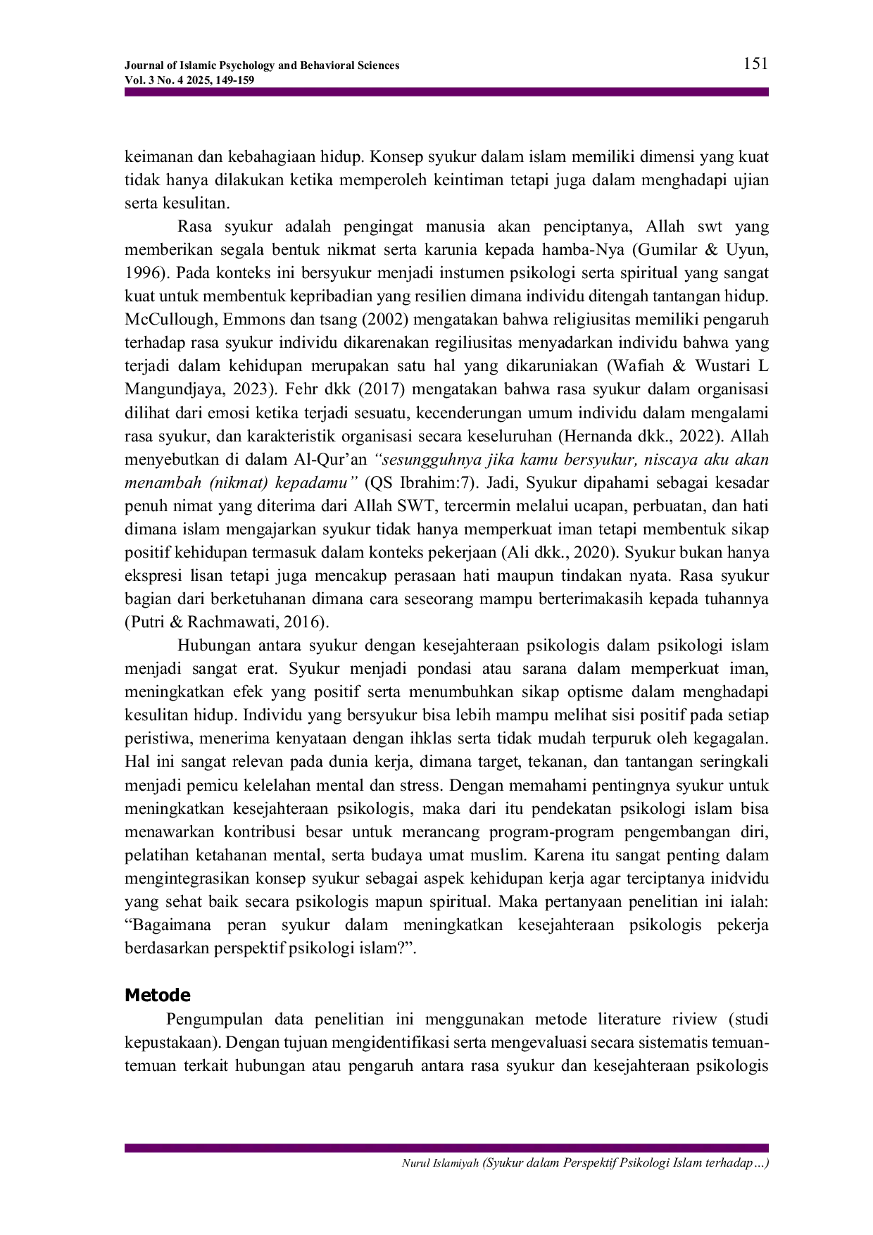 Journal of Islamic Psychology and Behavioral SciencesJournal of Islamic Psychology and Behavioral SciencesPenelitian ini bertujuan untuk mengkaji hubungan antara rasa syukur (gratitude) dalam perspektif psikologi Islam dan kesejahteraan psikologis pekerja. Menggunakan metode naratif literature review, 11 artikel ilmiah yang diterbitkan antara tahun 2018 hingga 2025 dianalisis secara kualitatif dengan pendekatan komparatif. Hasil menunjukkan bahwa rasa syukur secara konsisten berkontribusi positif terhadap berbagai dimensi kesejahteraan psikologis, seperti makna hidup, emosi positif, dan kualitas relasi sosial di berbagai konteks pekerjaan. Dalam pandangan Islam, syukur diposisikan sebagai bentuk ibadah dan penguatan spiritual yang berfungsi sebagai mekanisme adaptif menghadapi tekanan kerja. Temuan ini menegaskan bahwa integrasi nilai syukur dalam pendekatan psikologi Islam bisa memperkaya intervensi kesejahteraan secara holistic. Penelitian selanjutnya disarankan mengembangkan pelatihan syukur dan instumen pengukuran berbasis nilai-nilai Islam dalam mendukung kesejahteraan pekerja secara berkelanjutan.
