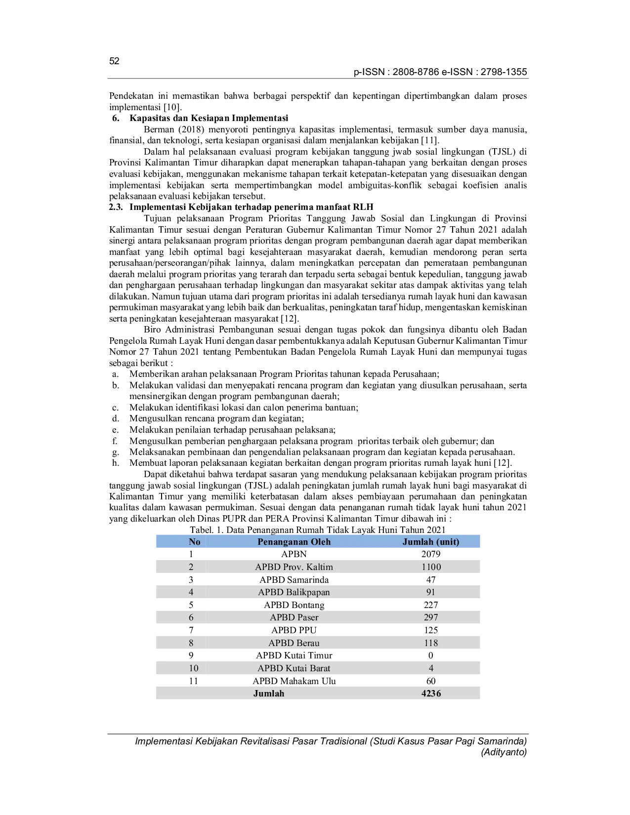 Implementasi kebijakan revitalisasi Pasar Pagi Samarinda mencakup aspek komunikasi, sumber daya, disposisi, dan struktur birokrasi.Upaya komunikasi Pemerintah Kota Samarinda telah memberikan pemahaman yang lebih jelas kepada pedagang mengenai tujuan dan proses revitalisasi, namun masih ada kendala dalam keterlibatan pedagang dalam proses pengambilan keputusan.Faktor penghambat utama dalam implementasi kebijakan ini meliputi relokasi yang sepihak, lokasi yang tidak layak, aksesibilitas yang kurang memadai, dan penurunan pendapatan pedagang.Oleh karena itu, diperlukan peningkatan keterlibatan pedagang, pemilihan lokasi yang strategis, dan peningkatan aksesibilitas untuk memastikan keberhasilan revitalisasi pasar.